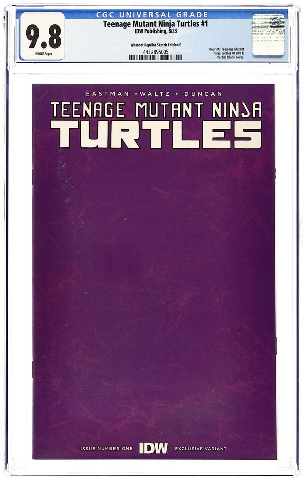 Reprint Edition. WhatNot and SMZ Comics Exclusive "Purple" Partial Blank Sketch Cover. Kevin Eastman, Tom Waltz (w) o Dan Duncan (a) Sam Kieth, Duncan x 4 (c) They're BACK! This summer, the original heroes in a half-shell make a triumphant return to comics! Leonardo, Donatello, Michaelangelo, and Raphael reunite to bring their ninja aptitude and teenage attitude to IDW Publishing in this all-new, action-packed series. Featuring a cast of familiar characters-Master Splinter, April O'Neill, Casey Jones, and more-and true to the spirit of the original comics created by Kevin Eastman and Peter Laird, the TEENAGE MUTANT NINJA TURTLES are bigger and badder than ever, and ready to rock old and new fans alike! Grade: CGC 9.8 explanation of grade Condition: Used (collectible)