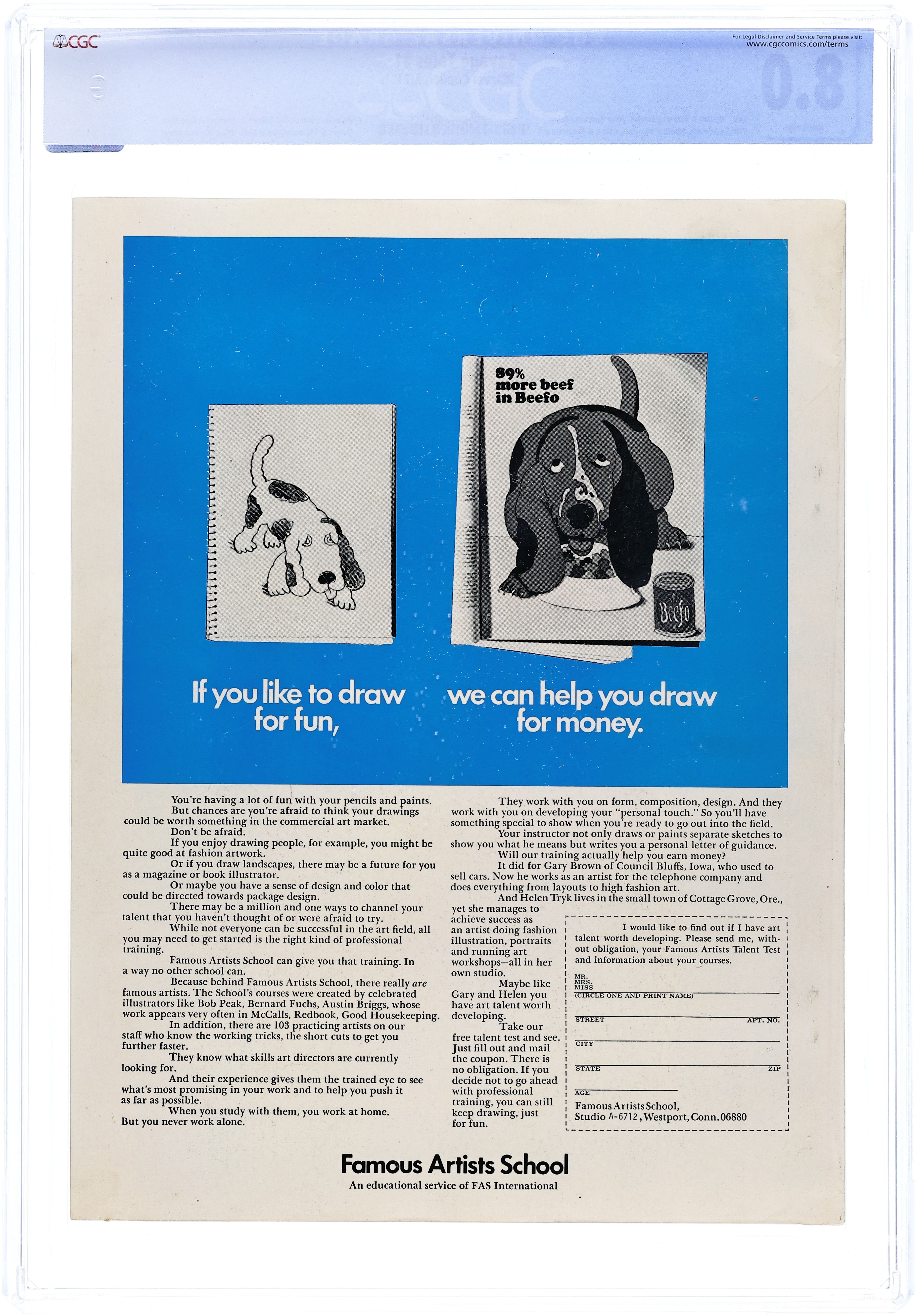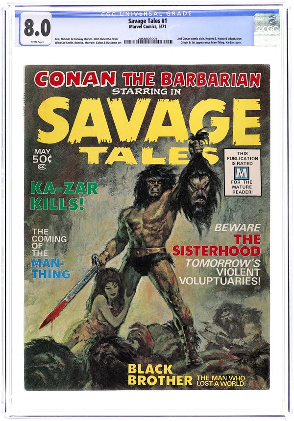 Starts Jan 3 Issue #1. May 1971. Conan stars in "The Frost Giant's Daughter" (script by Roy Thomas, art by Barry Windsor-Smith). Adapted from the story by Robert E. Howard. Later reprinted in color (with one additional new splash page) in "Conan the Barbarian" #16. First appearance of Man-Thing in "Man-Thing" (script by Roy Thomas and Gerry Conway, art by Gray Morrow). Story continues in "Astonishing Tales" #12. Other stories include "The Fury of the Femizons" (script by Stan Lee, art by John Romita Sr.; story continues in "Fantastic Four" #151); "Black Brother" (script by Denny O'Neil as "Sergius O'Shaughnessy", pencils by Gene Colan, inks by Tom Palmer); and "The Night of the Looter" (script by Lee, art by John Buscema). Painted cover by Buscema. Note: First appearance of Man-Thing. 8.25" x 11". 68 pages. Black and white. Mature. Cover price $0.50. Grade: CGC 8.0 explanation of grade Condition: Used (collectible)