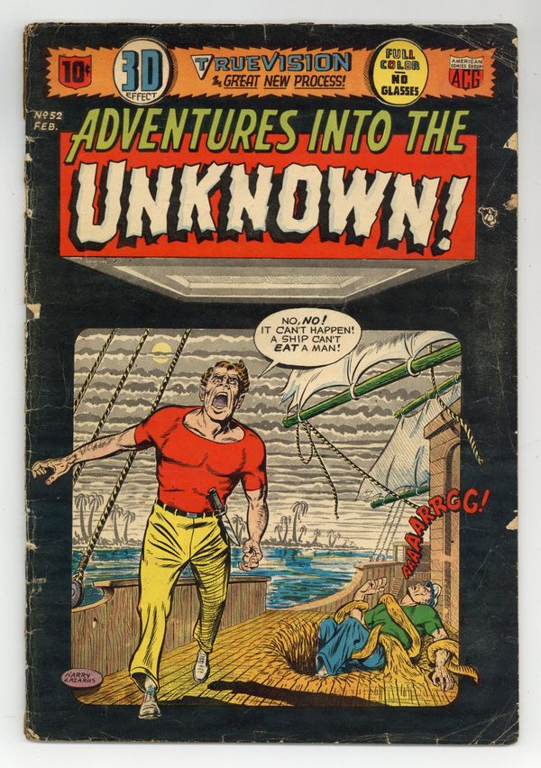 Cover art by Harry Lazarus. Monster In The Fog, art by Harry Lazarus; Two men take a rich man out on their boat fishing and run into a strange old boat. They make the mistake of boarding the boat looking for gold. The Old Gold Ring text story. The Year of the Bat, art by Harry Lazarus; While taking Norma Stanhope home from a date Chris sees a vampire fly out of a house. An article talking about the new "TrueVision" method of telling stories; It asks for reader's input on what they think of the method and reprints two short letters from Dorothy Schirmers and P. Menendez. Till Death Do Us Part, art by Harry Lazarus; Ethan's wife Fay dies when the local doctor can't save her. An advertisement for Pro Baseball Game. 36 pgs. Cover price $0.10. Grade: PR 0.5 explanation of grade Condition: Used (collectible)