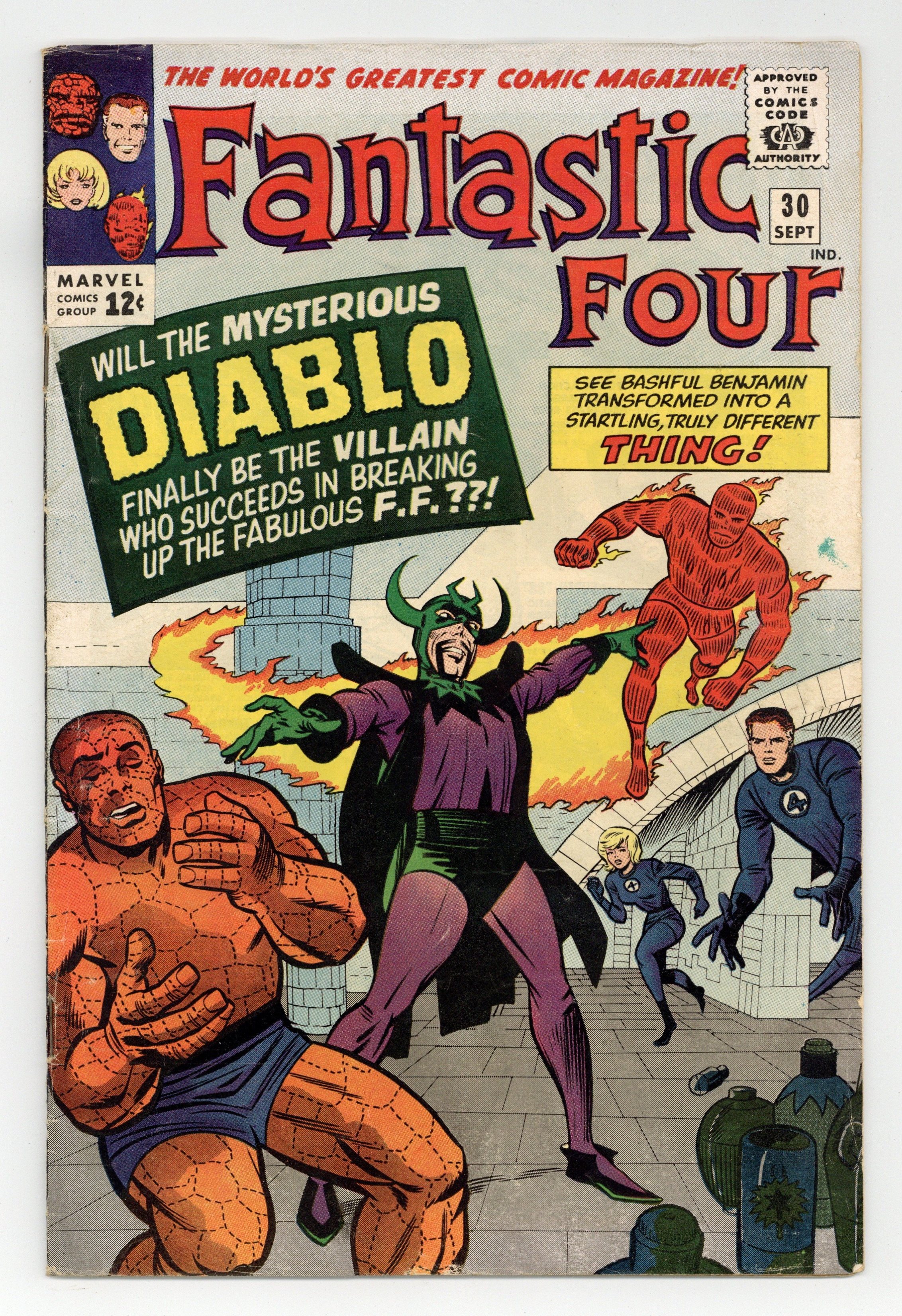 "The Dreaded Diablo!" Written by Stan Lee. Pencils by Jack Kirby. Inks by Chic Stone. Cover pencils by Jack Kirby with inks by Chic Stone. On a vacation in Transylvania, the FF encounter a castle inhabited by Diablo. Note: First Appearance of Diablo. 36 pgs. Cover price $0.12. Grade: VG 4.0 explanation of grade Condition: Used (collectible)