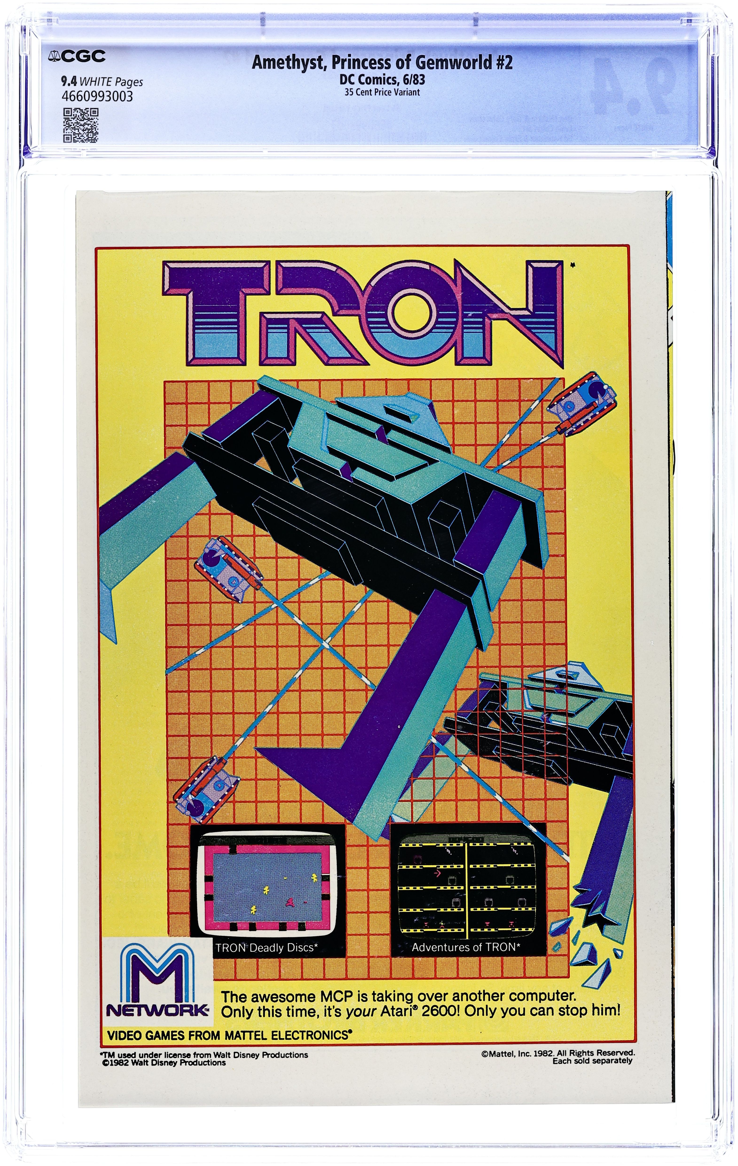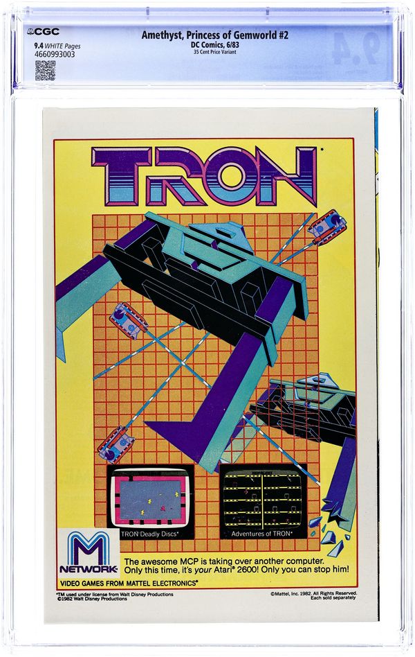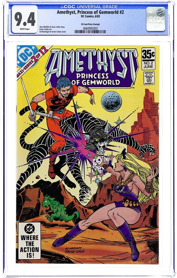 This is the 35-cent cover-priced edition which was test marketed only in St. Louis, Missouri and Austin, Texas. Cover pencils by Ed Hannigan, inks by Ernie Colón. "Cat and Mouse," script by Dan Mishkin and Gary Cohn, art by Ernie Colón; After an unsuccessful attempt by Lord Sardonyx to capture the princesses Amethyst, Carnelian, the son of Dark Opal, tries his luck at the task. DC Anniversary Issues ad. Article that introduces Amethyst and the creators behind it. 36 pgs., full color. Cover price $0.35. Grade: CGC 9.4 explanation of grade Condition: Used (collectible)