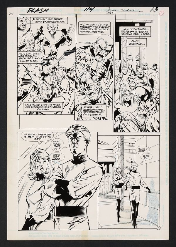 - Finding himself in the 30th century, Wally West comes upon the lynching of a Coluan and becomes the target of the mob himself! His only hope for escape lies in Don and Dawn Allen, the twin children of Barry who themselves weren't too happy to see the man who knew their father better than they ever could. A dramatic, harrowing page thanks to the perfect mixture of DC lore, real world parallels, and family dynamics! Signed by Jimenez in top margin. Pencil, ink, and screentone on DC Comics art board. 11 1/2" x 16 1/2".