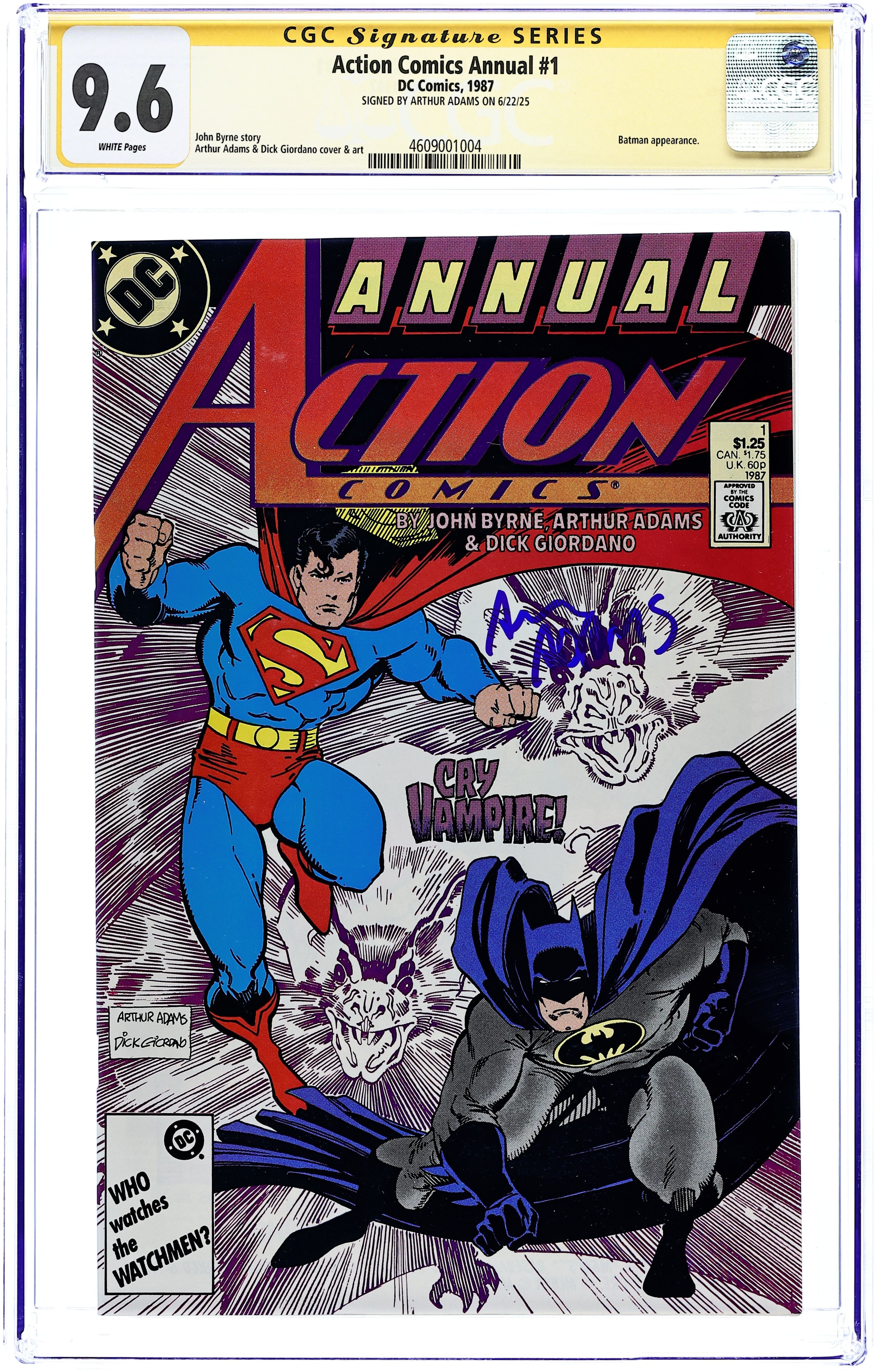 "Cry Vampire!" Guest-starring Batman. Written by John Byrne. Art and cover by Arthur Adams. The World's Finest may have bitten off more than they can chew when they investigate a series of murders and find themselves confronted with the immortal macabre power of the vampire! 48 pages, FC. NOTE: Fantastic horror story with amazing art by two of the all time greats. - Odinson, Lone Star Comics Archivist Cover price $1.25. Grade: CGC 9.6 explanation of grade Condition: Used (collectible)