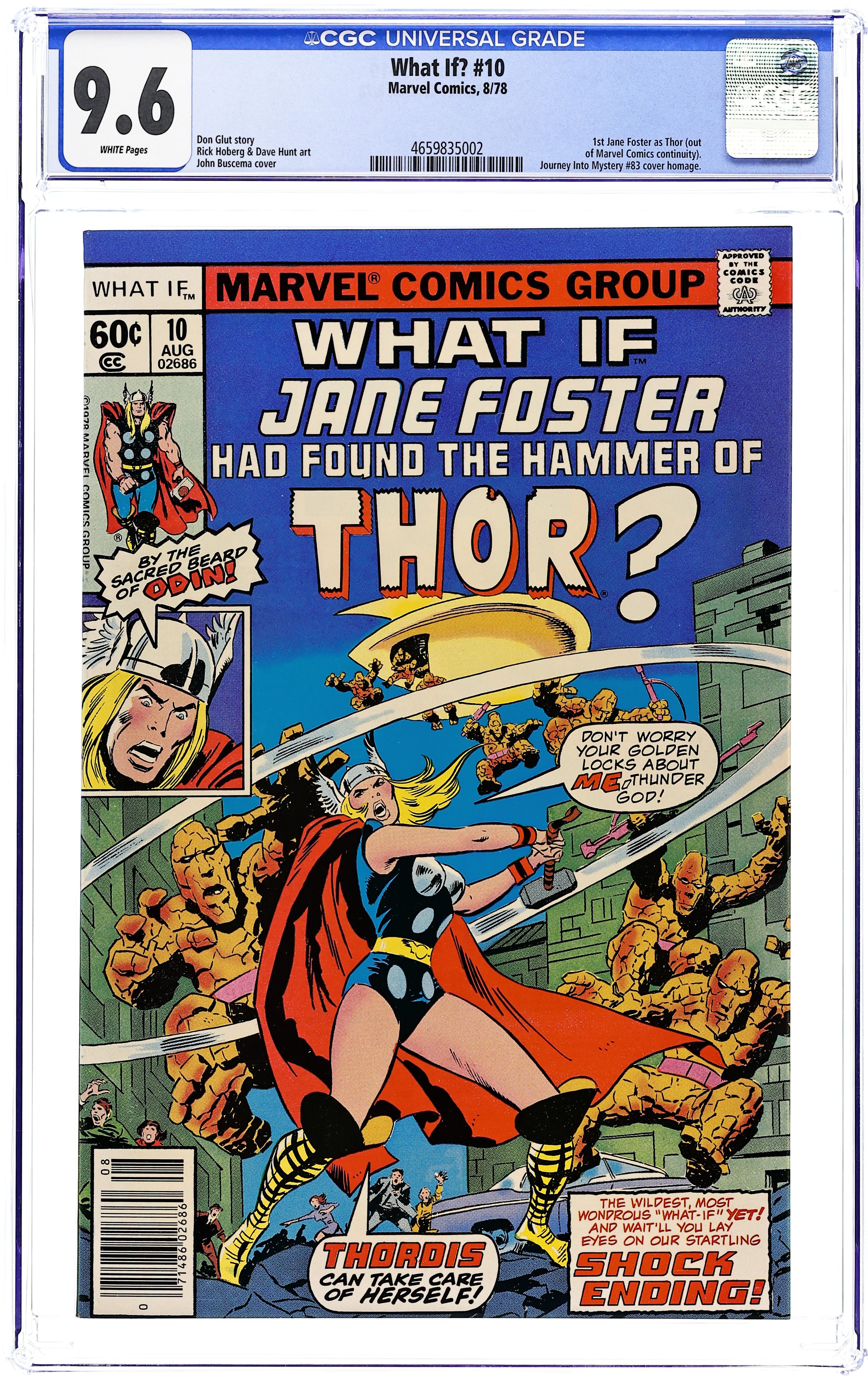 Cover art by John Buscema. What if Jane Foster had Found -- the Hammer of Thor?, script by Don Glut, pencils by Rick Hoberg, inks by Dave Hunt; Jane Foster finds the Hammer instead of Don Blake and becomes "Thordis." Hostess Fruit Pie ad with Spider-Man, pencils by Sal Buscema, inks by Joe Sinnott. 52 pgs. Cover price $0.60. Grade: CGC 9.6 explanation of grade Condition: Used (collectible)