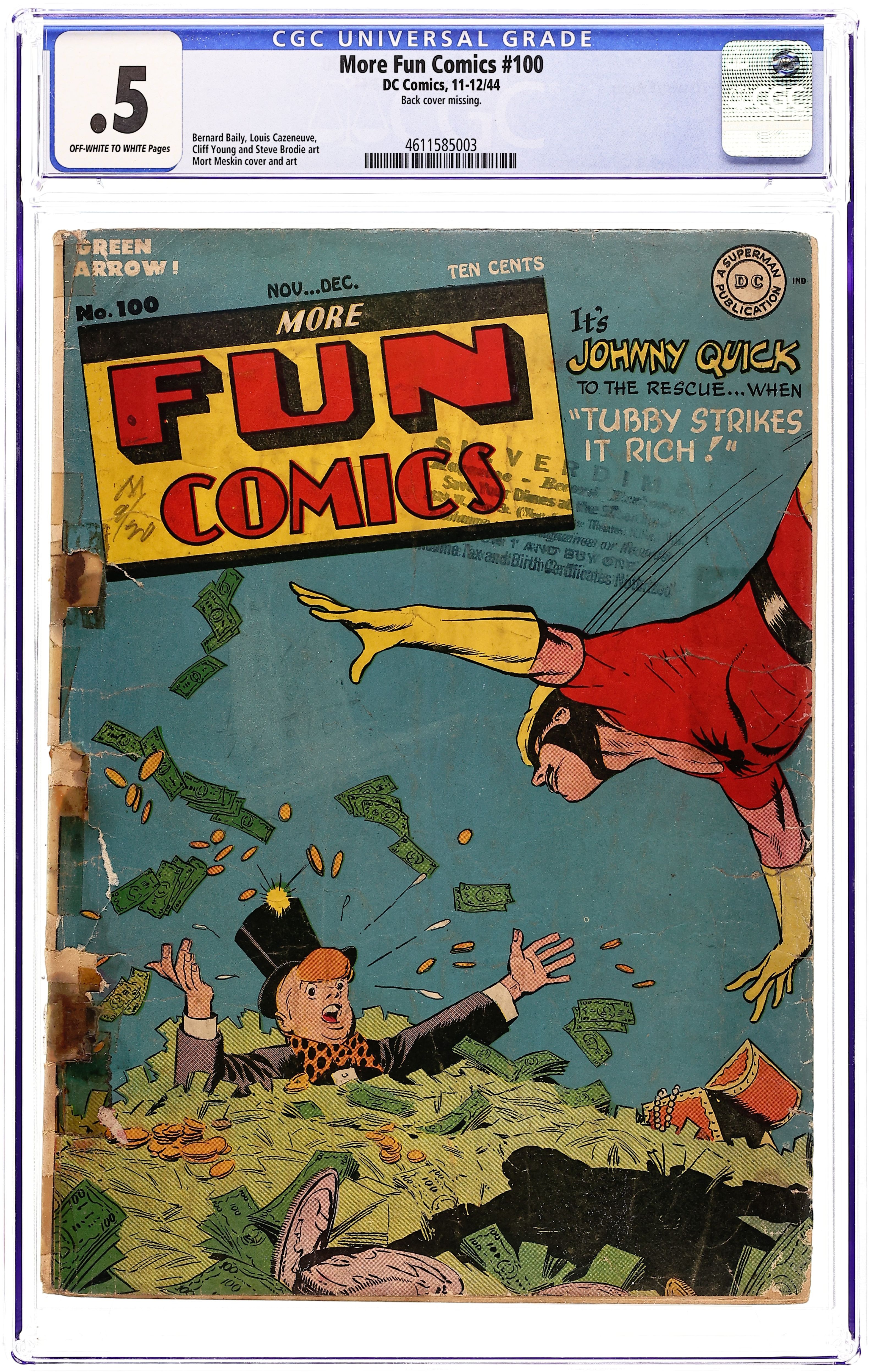 Cover by Mort Meskin. "Tubby Strikes It Rich" starring Johnny Quick, art by Mort Meskin (as Mort Morton, Jr); Tubby thinks his uncle has died and left him 10 million dollars. "The Captain of Cactus Gulch," script by Joe Samachson, art by Louis Cazeneuve; Unscrupulous characters convince a landlubber to pretend to be a whaling captain. "The Green Arrow's Secret Past," pencils by Cliff Young, inks by Steve Brodie; Big Gus and Mazie try to convince Speedy the Green Arrow used to be a crook and spent time in the big house. "Masks and Mystery," art by Henry Boltinoff. Officer Rollins' crippled son Teddy makes puppets of Percival and the Spectre. 52 pgs., full color. $0.10. Cover price $0.10. Grade: CGC 0.5 explanation of grade Condition: Used (collectible)