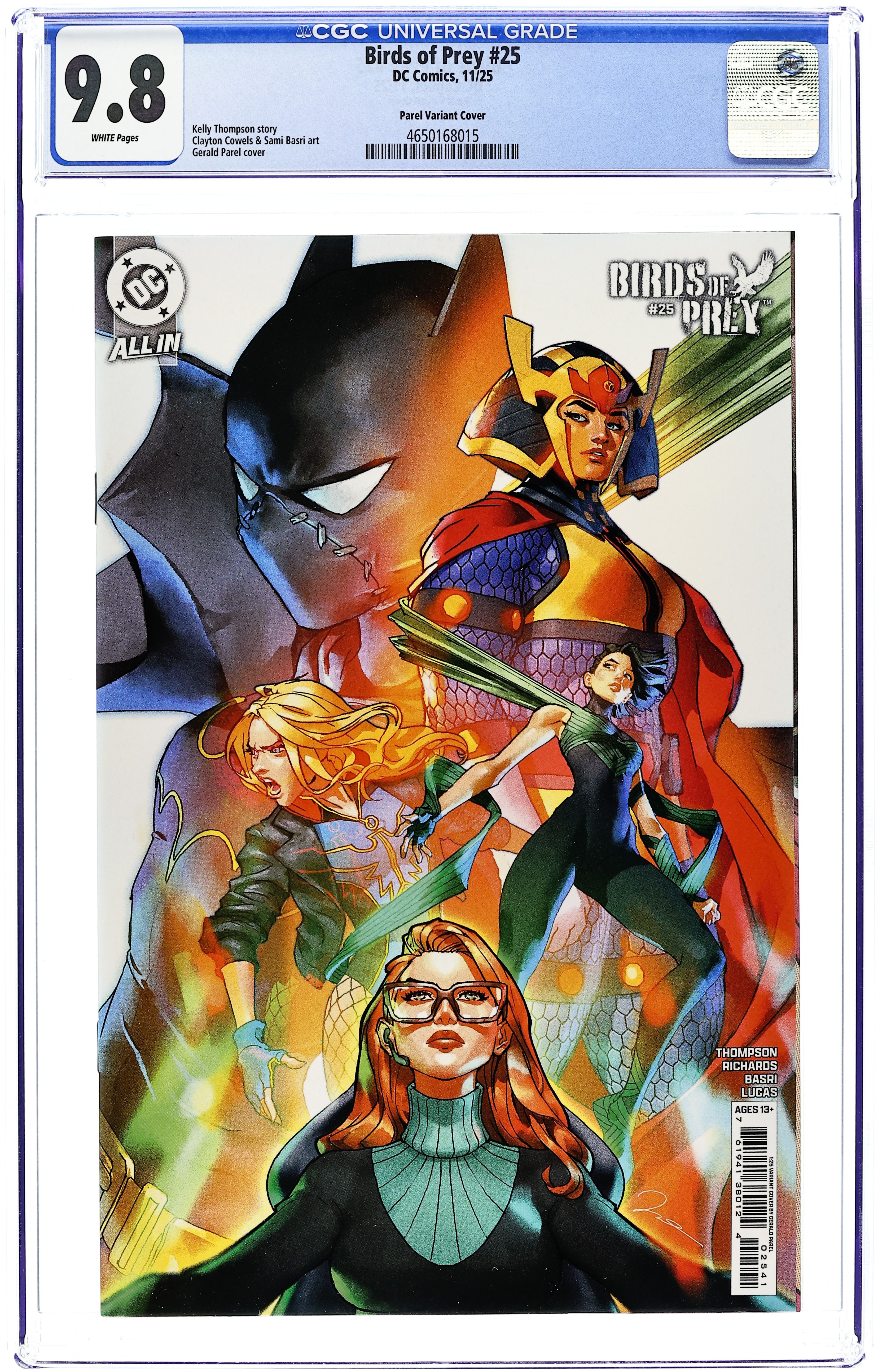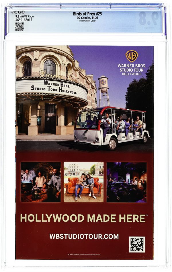 Starts Dec 22 Limited 1 for 25 Retailer Incentive Variant Cover. Written by Kelly Thompson. Art by Cliff Richards, Sami Basri. Cover by Gerald Parel. CELEBRATE THE 25TH ISSUE OF BIRDS OF PREY! The Birds of Prey took the fight to The Shadow Army and won--but that was merely the Shadow Army's first move and their endgame is only just beginning. After an unexpected ally emerges, the Birds find themselves racing against the clock to stop a game called The Unreality that is primed to become a mass casualty event in Gotham. To stop it, the Birds will need to go undercover, enter the game, dismantle it at its source...and somehow make it out alive. 32 pages, full color. Rated T+ Cover price $4.99. Grade: CGC 9.8 explanation of grade Condition: Used (collectible) unless item is a new release