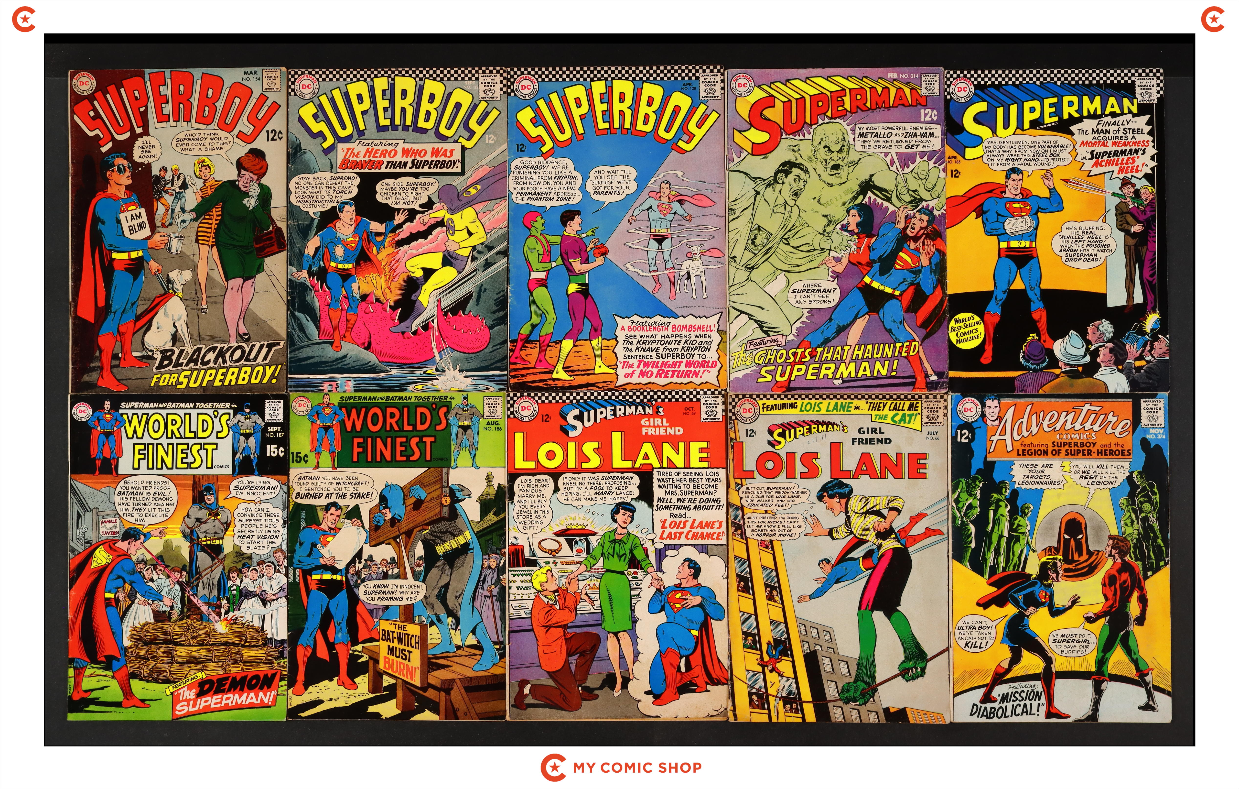 Issues 185 and 214 of Superman (1939 1st Series); 128, 132, and 154 of Superboy (1949-1979 1st Series DC); 374 of Adventure Comics (1938 1st Series); 66 and 69 of Superman's Girlfriend Lois Lane (1958); and 186, 187, 219, and 224-226 of World's Finest (1941). Most will grade in the FN to VG with a few grading GD.