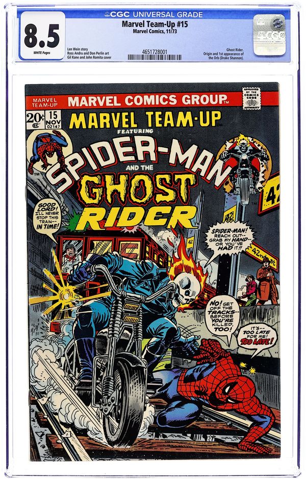 Spider-Man and Ghost Rider in "If An Eye Offend Thee." Script by Len Wein. Pencils by Ross Andru. Inks by Don Perlin. Cover by Gil Kane, Frank Giacoia, and John Romita. Spider-Man and Ghost Rider battle the Orb. First meeting between Spider-Man and Ghost Rider. Origin and first appearance of the Orb. The Orb appears next in Ghost Rider (1st series) 14. This issue was first reprinted in Marvel Treasury Edition 18 and Marvel Tales 254. 36 pages. Cover price $0.20. Grade: CGC 8.5 explanation of grade Condition: Used (collectible)