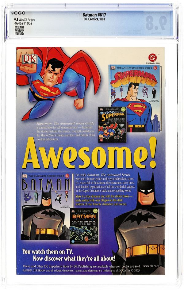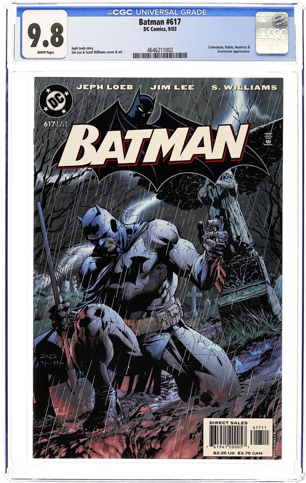 WRITTEN BY JEPH LOEB; ART AND COVER BY JIM LEE AND SCOTT WILLIAMS In stores July 30. With just three issues to go, the mystery of "Hush" deepens! For months, the relationship between Batman and Catwoman has been heating up. Everyone seems happy about it, except for Robin, the Boy Wonder! Robin's got some issues with Catwoman and the secrets she knows. Does Batman's young partner have the stuff to take out Catwoman? Or will the Cat swallow the little bird? It all leads up to Batman making the most startling discovery of all...and here's a hint: The story is titled "The Grave!" For more information, see the feature article. 36 Pages, Full Color. Cover price $2.25. Grade: CGC 9.8 explanation of grade Condition: Used (collectible)