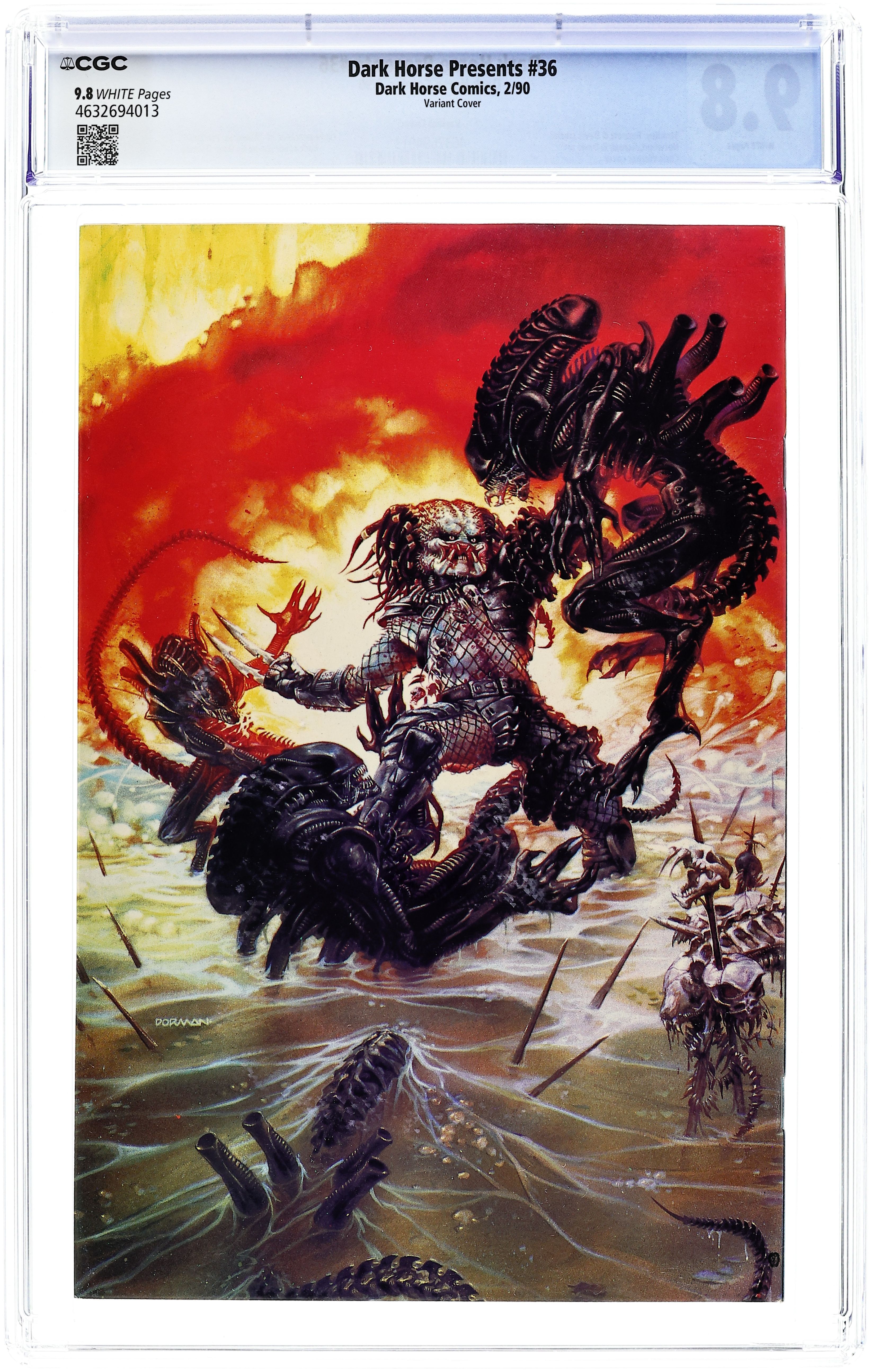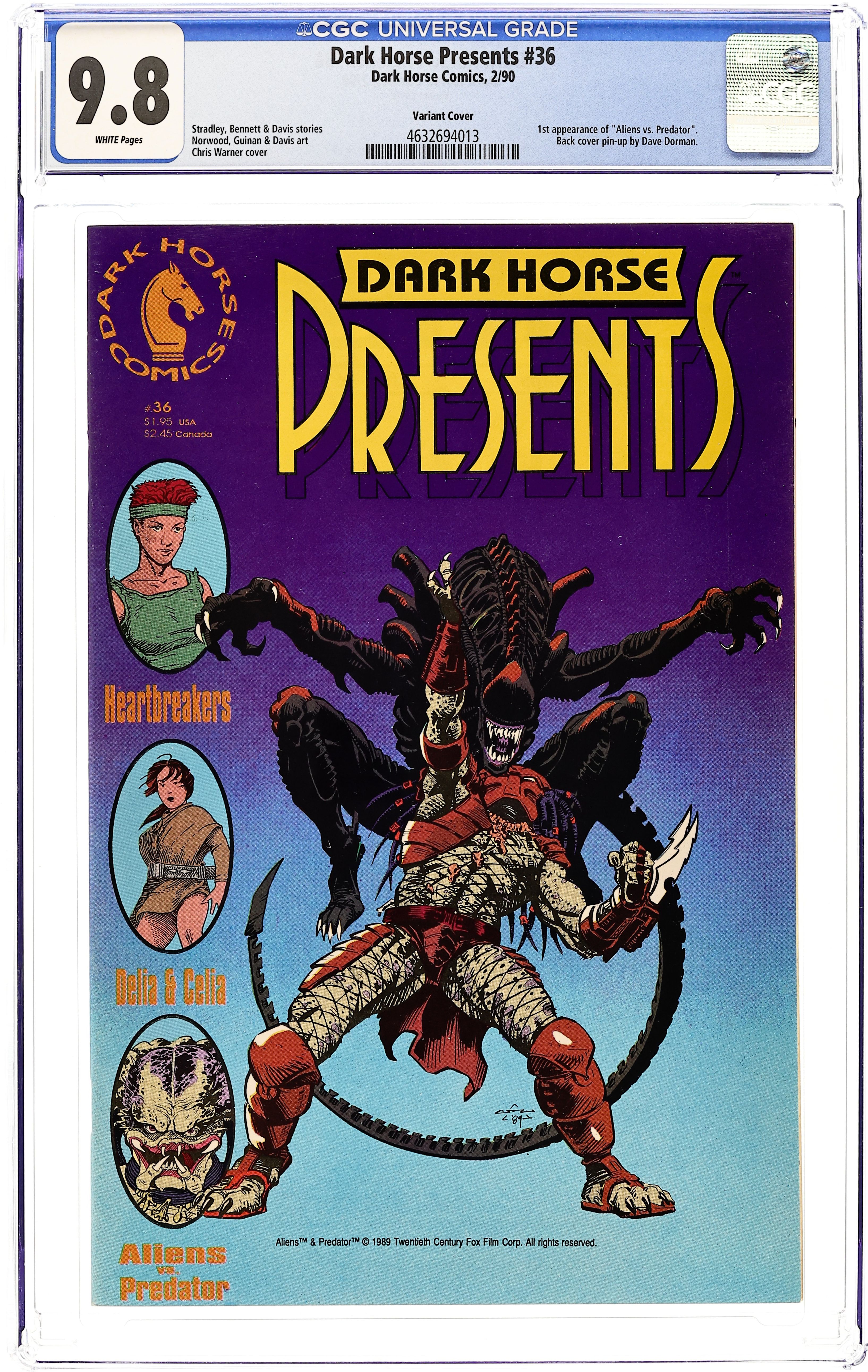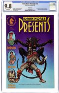Cover by Chris Warner. The most eagerly-awaited storyline begins in this month's issue of Dark Horse Presents! They are the galaxy's most deadly alien races; now, the time has come for them to meet at last! It's the Aliens and Predator together in one story! The confrontation of the century brought to you by Randy Stradley and film designer (The Abyss and Robocop II) Phillip Norwood! The story will then continue in a full-color miniseries coming out next month! Also, Paul Guinan and Anina Bennet continue the story of The Heartbreakers--beautiful and deadly clones! Plus, the further "sword and sorcery" adventures of Delia and Celia by Gary Davis! 32 pages, B&W. Cover price $1.95. Grade: CGC 9.8 explanation of grade Condition: Used (collectible)