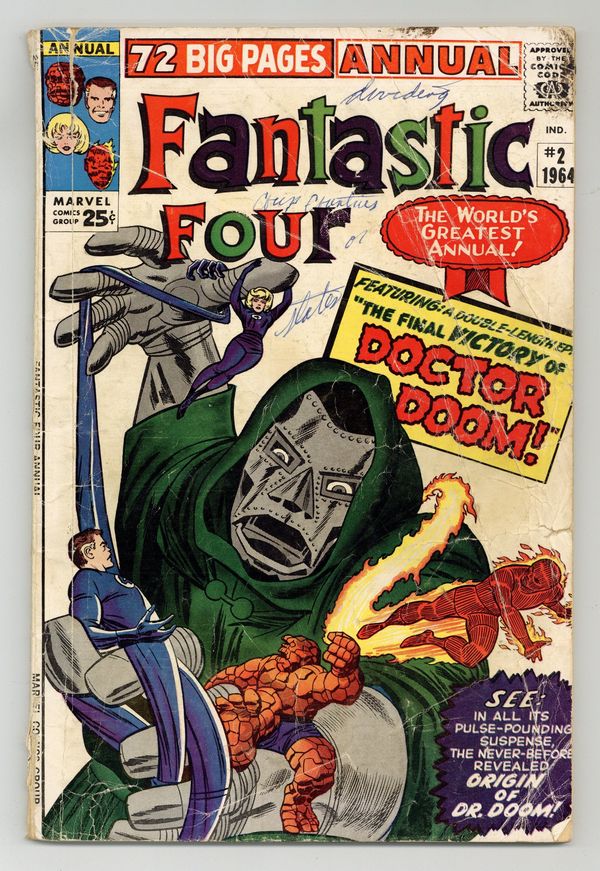 Starts Jan 3 2 new Doctor Doom stories, "Origin of Doctor Doom!" and "The Final Victory of Dr. Doom!" Scripts by Stan Lee, pencils by Jack Kirby, inks by Chic Stone. Six pages of pin-ups by Kirby/Sol Brodsky. This issue also reprints "Prisoners of Doctor Doom" (from FF 5). Kirby/Stone cover. 76 pgs. Cover price $0.25. Grade: GD- 1.8 explanation of grade Condition: Used (collectible)