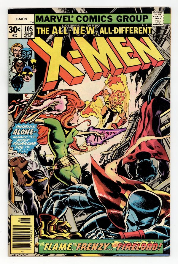 "Phoenix Unleashed!" Part 1 of 3. Guest-starring Firelord and Misty Knight. Story by Chris Claremont. Art by Dave Cockrum and Bob Layton. The sinister Eric the Red makes his move. Charles Xavier is stunned when he is finally confronted with the beauty from his visions. Plus, Phoenix must face the awesome power of Firelord, former Herald of Galactus! Story continues in Uncanny X-Men #107. NOTE: Lilandra's name is revealed for the 1st time. 36 pgs. Cover price $0.30. Grade: FN+ 6.5 explanation of grade Condition: Used (collectible)
