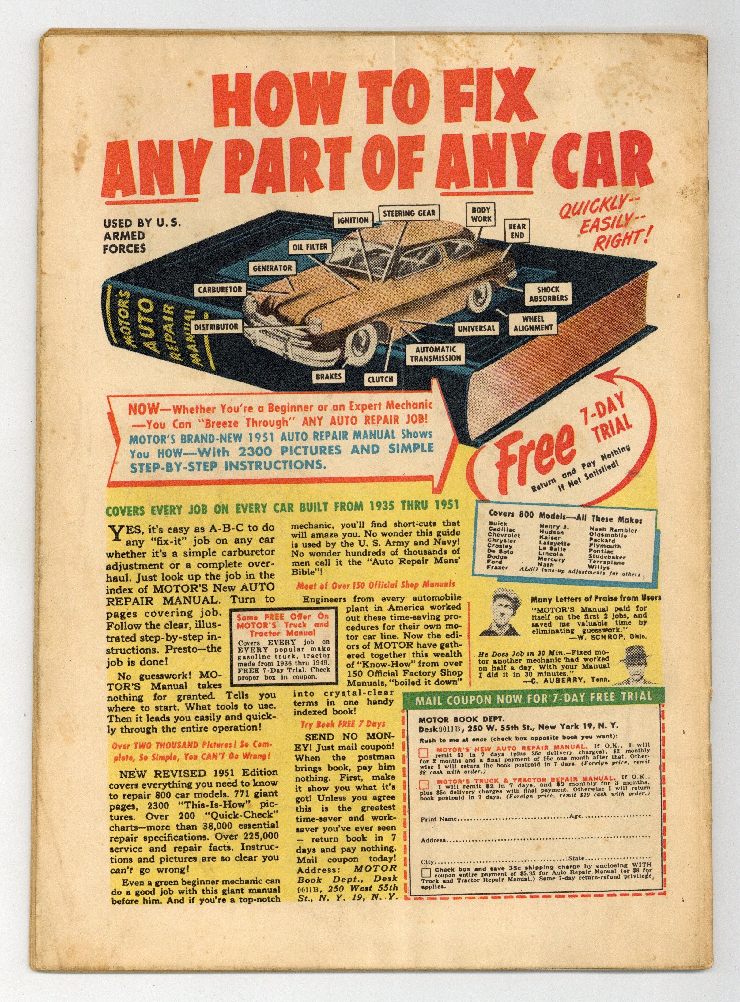 "The Were-Tiger of Assam," "The Zombie's Eyes," "The Spectral Pirate," and "Assault From the Unknown." Edited by Richard E. Hughes. Cover by Ken Bald. Stories by Charles Sultan, Lin Streeter, Al Camy, Ed Moritz, and Paul Gattuso. Spine-chilling tales of suspense, horror, and the supernatural—prepare yourself for Adventures into the Unknown! 52 pages, full color. $0.10. Cover price $0.10. Grade: GD/VG 3.0 explanation of grade Condition: Used (collectible)