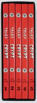 Printings on Volumes may vary - Includes Vol. 1-5. Vol. 1: Collects Collects Crypt of Terror (1950) #17-19 and Tales from the Crypt (1950-1955 E.C. Comics) #20-22; Vol. 2: Collects Tales from the Crypt (1950-1955 E.C. Comics) #23-28; Vol. 3: Collects Tales from the Crypt (1950-1955 E.C. Comics) #29-34; Vol. 4: Collects Tales from the Crypt (1950-1955 E.C. Comics) #35-40; and Vol. 5: Collects Tales from the Crypt (1950-1955 E.C. Comics) #41-46. Over 1,000 pages of Horror thrills and chills! Each Volume is - Hardcover, 9-in. x 12-in., 200 pages, B&W. Grade: FN+ 6.5 explanation of grade Condition: Used (collectible)