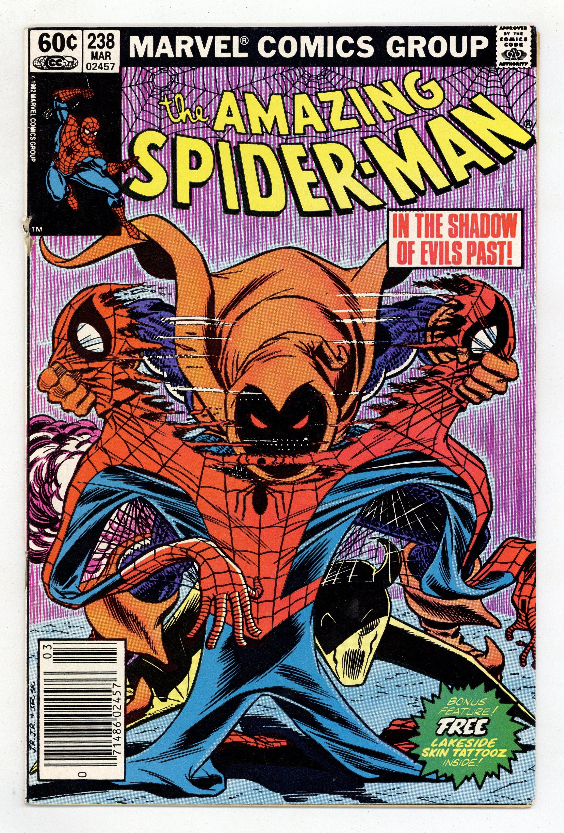 IMPORTANT: Issue 238B DOES NOT come with Lakeside Skin Tattooz (insert may be present, but tattoo is missing either way). Newsstand Edition. First appearance of the Hobgoblin in "Shadow of Evils Past!" Script by Roger Stern. Art by John Romita Jr. (breakdowns) and John Romita Sr. (finishes). Cover by John Romita Jr. and John Romita Sr. One of the landmark issues of the Amazing Spider-Man! And the beginning of the long secret identity mystery of the Hobgoblin! After escaping from the web-slinger, a bank robber stumbles upon an underground hideout of the (deceased) Green Goblin! Not knowing what to do with his discovery, the small-time hood shows the secret lair to an underworld associate! Unfortunately for the wondrous wall-crawler, the devious associate knows exactly what to do: resurrect the Green Goblin...with a twist! And a short time later a new super-villain is born! The Hobgoblin! Cameo appearance by Mary Jane Watson. Flashback cameo by Norman Osborn (aka the Green Goblin). (Notes: The secret identity of the original Hobgoblin takes many twists and turns over the next decade. Who actually operates as the Hobgoblin in this issue is revealed in the Spider-Man: Hobgoblin Lives (1997) Limited Series (written by Roger Stern). This issue was reprinted in Marvel Tales 257 and also in the 1992 trade paperback: the Amazing Spider-Man -- Origin of the Hobgoblin.) 36 pages. Cover price $0.60. Grade: VG 4.0 explanation of grade Condition: Used (collectible)