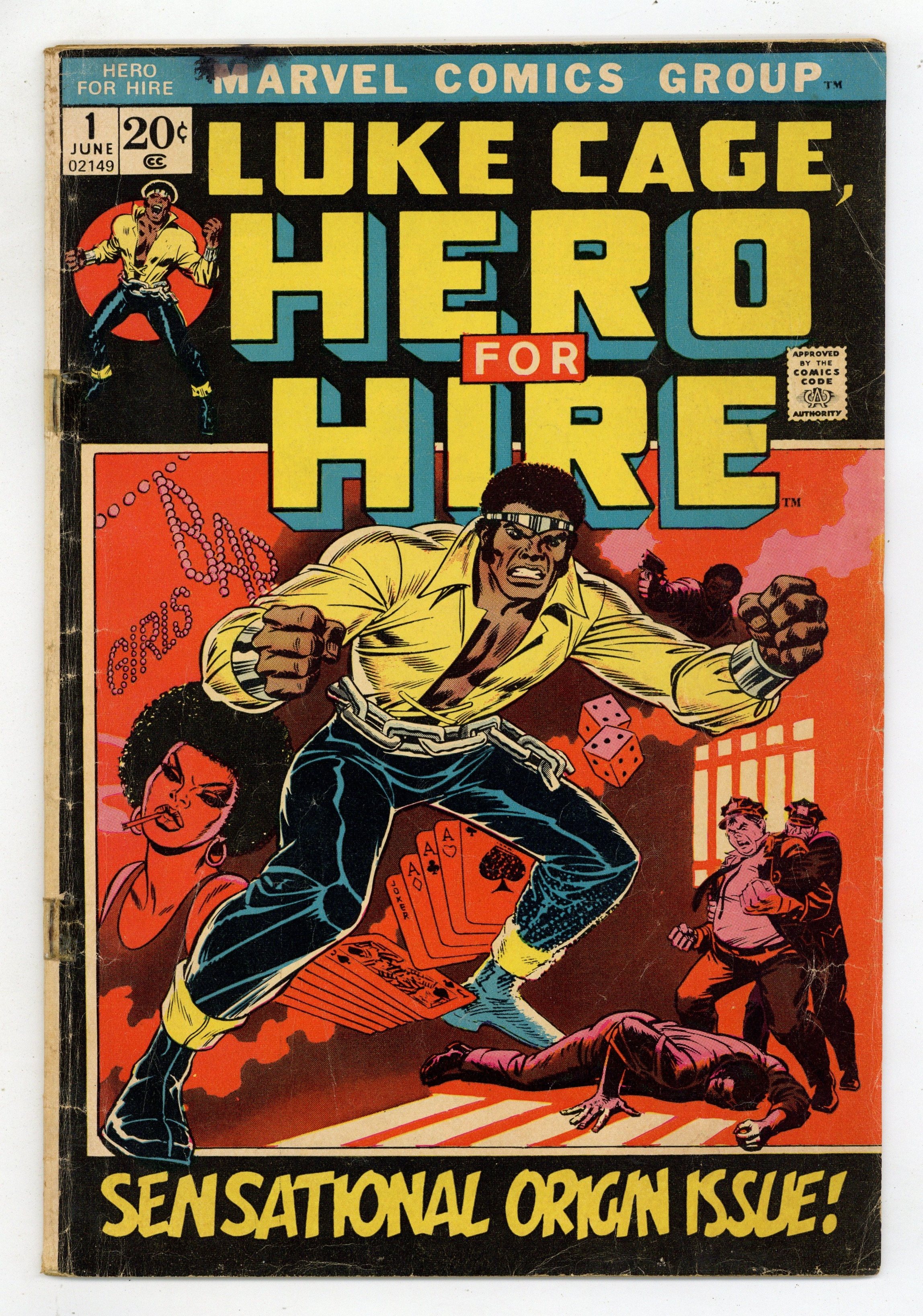 "Out of Hell--a Hero!" Script by Archie Goodwin, pencils by George Tuska, inks by Billy Graham. NOTE: Roy Thomas and John Romita are credited for their "considerable creative contributions." When Lucas, an innocent man, is sent to jail for a crime he did not commit, he decides he has nothing left to loose. Subjecting himself to unorthodox experiments, this inmate is endowed with great physical strength and nigh-unbreakable skin. No walls and bars on Earth can hold him. Now, as Luke Cage, he is known as the Hero for Hire, and he's here to clean up the "Mean Streets," one criminal at a time. Cover price $0.20. Grade: GD+ 2.5 explanation of grade Condition: Used (collectible)