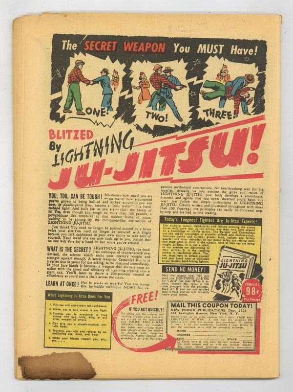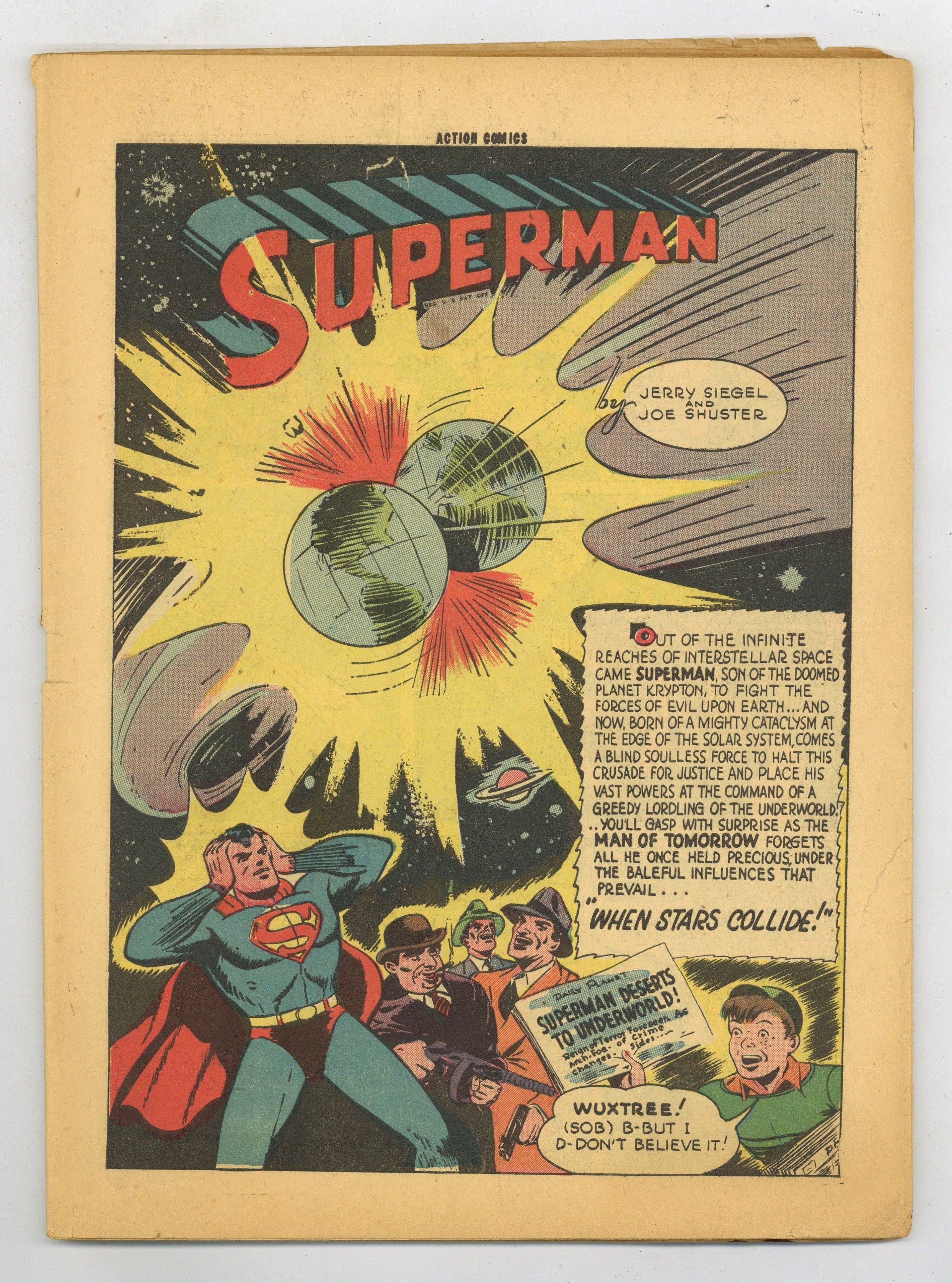 Japanese war cover by Jack Burnley. When Stars Collide starring Superman, script by Don Cameron (signed as Jerry Siegel), art by Ira Yarbrough (signed as Joe Shuster). Dummy, Dummy & Dummy, Inc. starring The Vigilante, script by Don Cameron, pencils by Mort Meskin (as Mort Morton Jr.). Leatherneck Luck starring Three Aces (last appearance), script by Gardner F. Fox, art by Louis Cazeneuve. A Right in der Fuehrer's Face starring Americommando, script by Joseph Greene, art by Bernard Baily. The Curse of Catellaria starring Congo Bill, art by John Daly. The Pirate of Pleasure starring Zatara, script by Gardner F. Fox, art by Joseph Sulman. 60 Pages, Full Color. $.10 Cover price $0.10. Grade: Coverless explanation of grade Condition: Used (collectible)