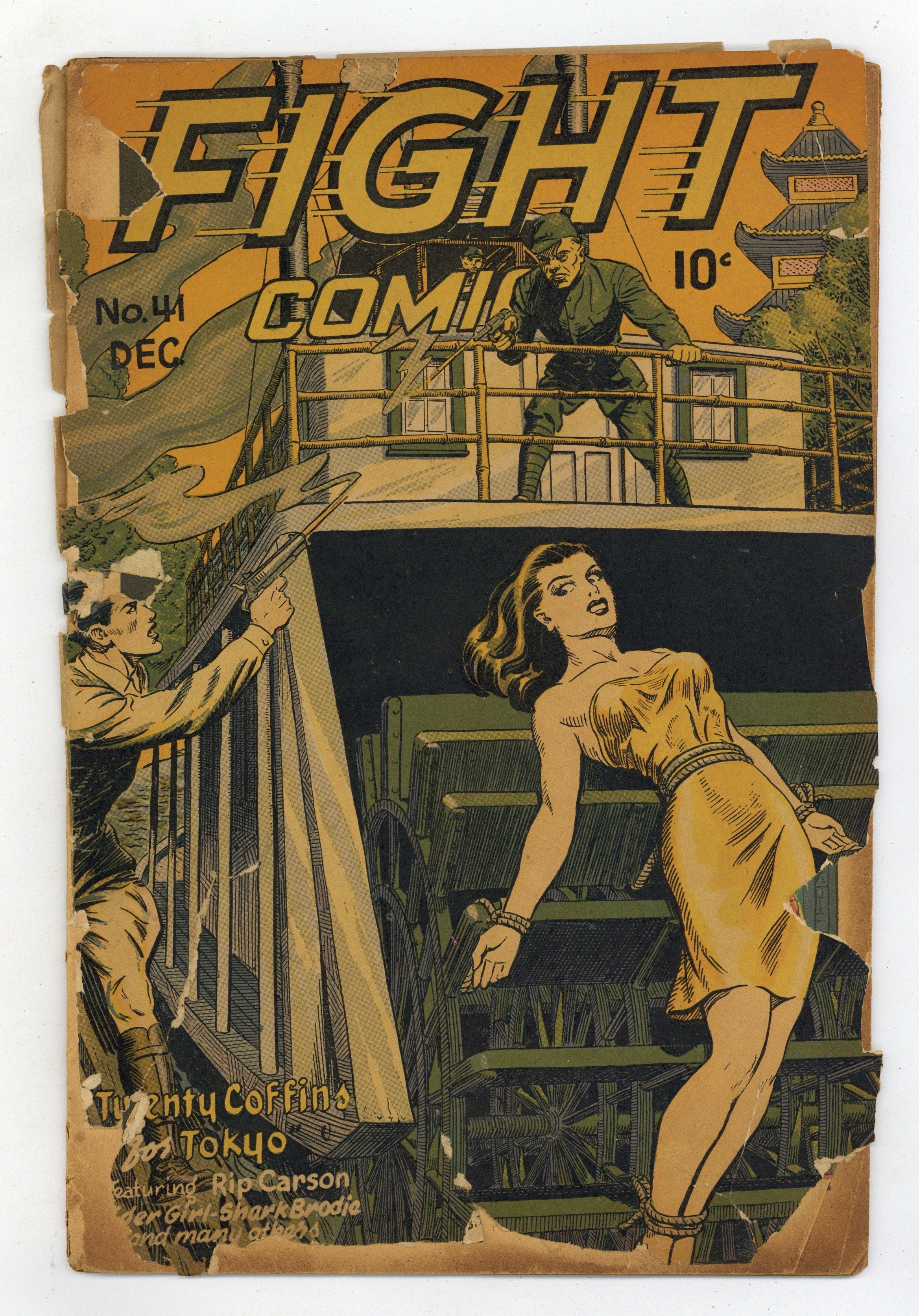 Cover by Joe Doolin. Edited by Jack Byrne and Jerry Iger. Stories and art by Robert Webb, Ann Brewster, Alex Blum, Lily Renee and Matt Baker. A combat-themed anthology from Fiction House that featured early work from many future comics legends (often uncredited) in the Eisner-Iger Shop. Tiger Girl battles a mad Dr. Moreau-type who turns jungle animals into half-human creatures; Hooks Devlin investigates a strange murder in the trick-riding ring of a county fair. Glamour-girl turned super-spy Senorita Rio battles escaped Nazi war criminals who plan to replace her with a duplicate. Featuring art by famed good-girl artist Matt Baker and pioneering female artist Lily Renee. Another creative bondage cover, this one involving a paddle-wheel boat. Flying Jeep; Tiger Girl; Rip Carson; Hooks Devlin; Senorita Rio; Shark Brodie. 36 pages, Full Color. Cover price $0.10. Grade: PR 0.5 explanation of grade Condition: Used (collectible)