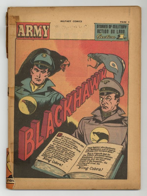 Cover art by Reed Crandall. King Cobra starring Blackhawk, script by Bill Woolfolk, art by Reed Crandall. Untitled stories starring Shot and Shell (script and art by Klaus Nordling), Private Dogtag (script and art by Bart Tumey), P.T. Boat (art by Art LeBlanc), and Sailor Danny (script and art by Art Gates). The Flying Battleship starring Sniper, script by Ted Udall, art by Vernon Henkel. U. S. Fliers Raid Germany featuring Secret War News, script and art by Fred Guardineer. 68 pgs. $0.10. Cover price $0.10. Grade: PR 0.5 explanation of grade Condition: Used (collectible)