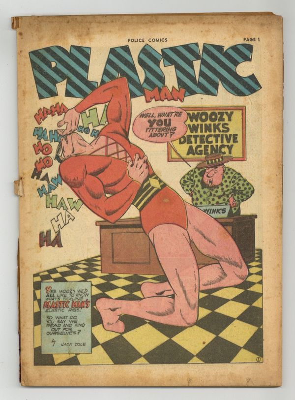 Cover by Jack Cole. "Woozy Winks Detective Agency," script and art by Jack Cole; Cole writes himself into the story as a stuttering dweeb: a dream tale in which the heroes are knocked out by an explosion; Then Woozy instructs Cole to draw the faces of crooks Abba and Dabba for a "wanted" poster while Plastic Man dreams of Woozy Winks and Jack Cole teaming up to stop the two villains. "The Case of the Kidnapped Corpse;" When a jeweler on his beat is murdered, Richards is suspended from his job. Eventually, the Manhunter solves the crime and Richard's suspension is commute. "Flatfoot's Substitute" starring Flatfoot Burns, script and art by Al Stahl. "Ogre Goran" starring The Spirit, script and art by Will Eisner. "Enter: The Raven," art by Frank Borth; After three attempts being made on Senator Knight's life, Phantom Lady decides to find out, once and for all, who is behind these attempts. "Curtain of Death" text story by Dick Mace. "The Three-Man Perfect Crime" starring Destiny. "The Ferry Boat's Tale" starring The Human Bomb, script and art by Paul Gustavson. 68 pgs., full color. $0.10. Cover price $0.10. Grade: PR 0.5 explanation of grade Condition: Used (collectible)