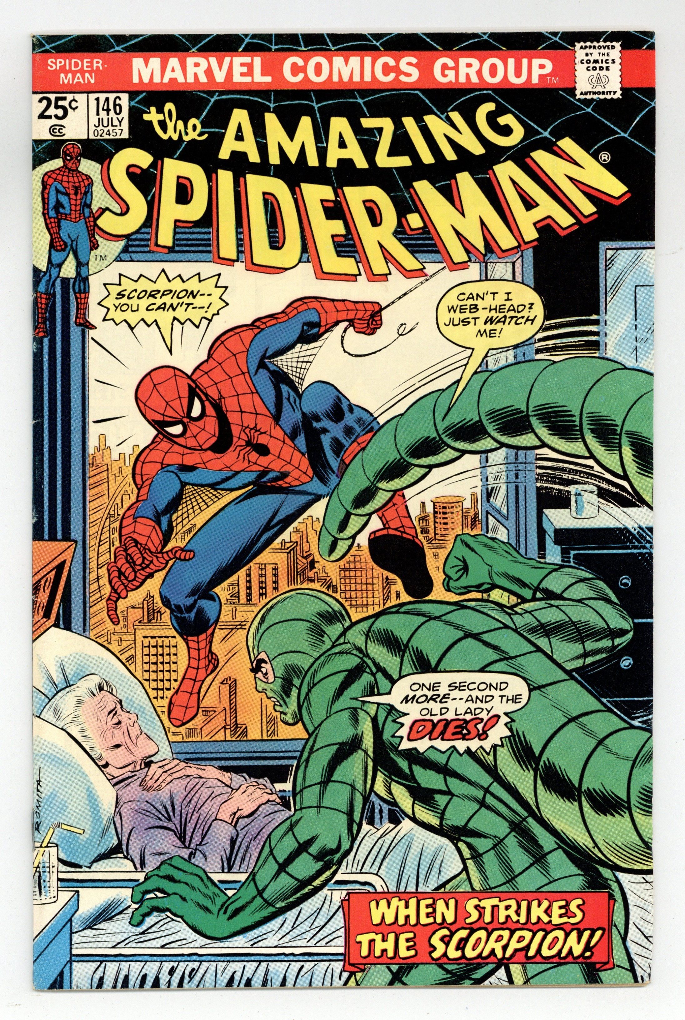 Starts Mar 2 "Scorpion...Where is thy Sting?" Part 2 of 2. Script by Gerry Conway. Pencils by Ross Andru. Inks by John Romita Sr., John Romita, Jr., Mike Esposito, Frank Giacoia, and John Tartaglione. Cover by John Romita Sr. While Aunt May's nephew comes to grips with the return of Gwen Stacy (clone), the devious Jackal once more plots the wall-crawler's violent demise! And this time he uses the unsuspecting Scorpion as his pawn! The Scorpion thought he killed Spidey last issue, but once Mac Gargan learns the truth; he wants another shot! So the Jackal tells him to look in May Parker's hospital room! What a cruel thing to do! And as depicted on the dynamic cover, the Scorpion indeed pays Aunt May a visit! But the super-villain with a sting wasn't counting on a fighting mad web-slinger in the waiting room! The beleaguered Scorpion doesn't stand a chance! Elements of the story continue in Giant-Size Spider-Man 5. (Note: The Scorpion returns in Ms. Marvel (1977 1st series #1. The letters page includes Marvel Value Stamp series A #67 Cyclops by George Tuska. This story was reprinted in Marvel Tales 123.) 36 pages. 25c cover price. Cover price $0.25. Grade: FN- 5.5 explanation of grade Condition: Used (collectible)