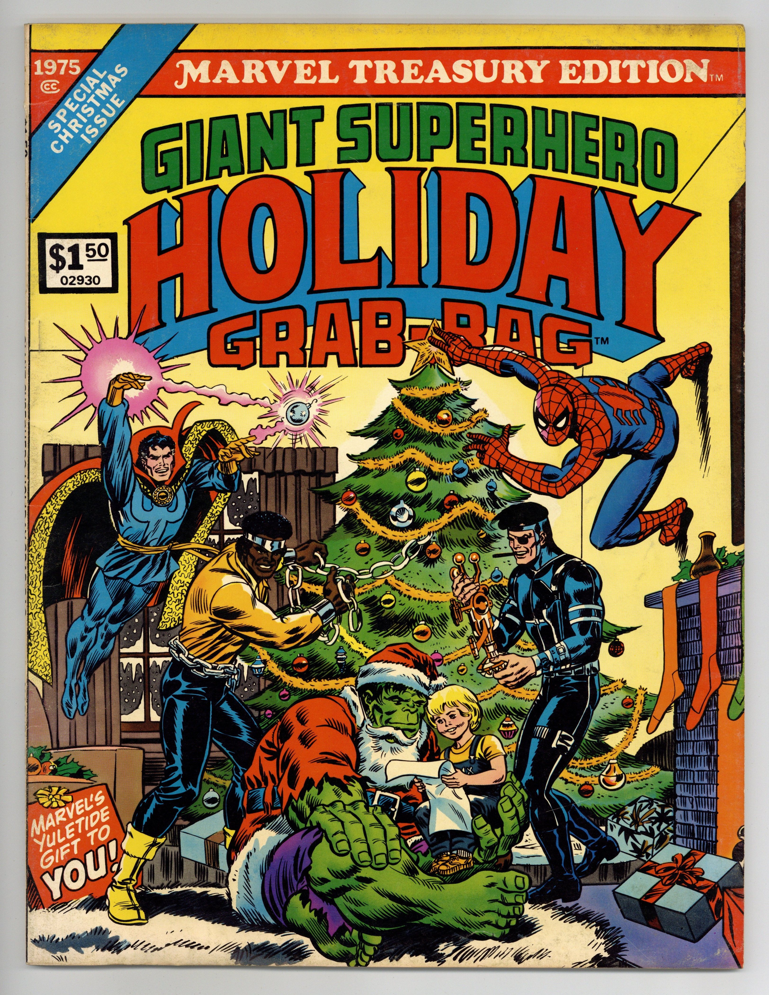 Marvel Treasury Edition (1974) #8 features a Giant Superhero Holiday Grab-Bag. This issue features the Christmas themed stories "Twas the Night before Christmas" (Reprints Nick Fury Agent of S.H.I.E.L.D. #10) by Gary Friedrich, Frank Springer, and Johnny Craig, "Spidey goes Mad" (Reprints Marvel Tales #19) by Stan Lee and Steve Ditko, "Jingle Bombs" (Luke Cage, Hero for Hire #7) by Steve Englehart, George Tuska, and Billy Graham, "Heaven is a Very Small Place" (Reprints Incredible Hulk #147) by Roy Thomas, Herb Trimpe, and John Severin, and "Eternity, Eternity" (Reprints Dr. Strange #180) by Roy Thomas, Gene Colan, and Tom Palmer. Featuring the villainy of Hate-Monger, Vulture, and Nightmare. 82 pages. Cover price $1.50. Grade: VG+ 4.5 explanation of grade Condition: Used (collectible)