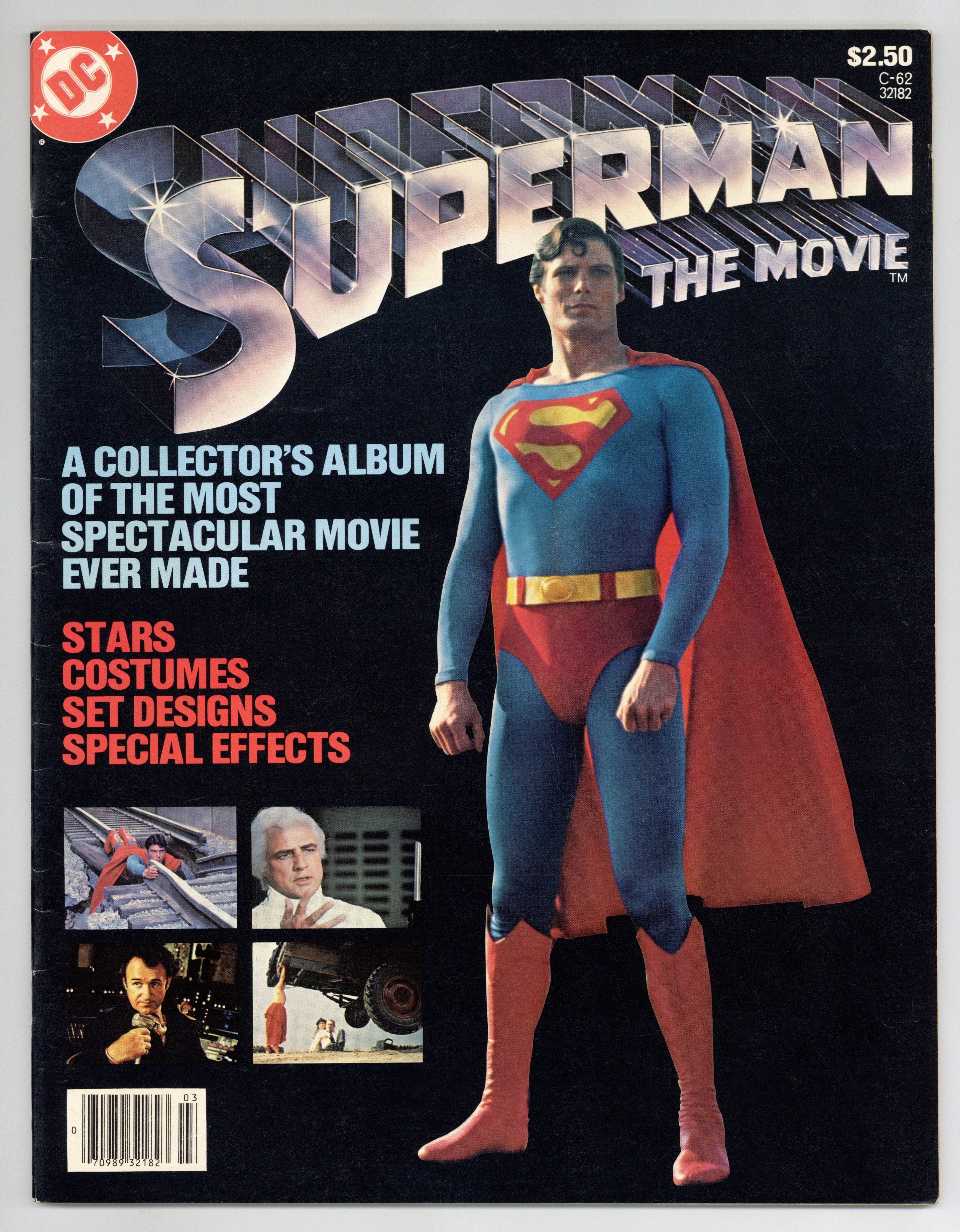 All-New Collectors' Edition: Superman the Movie. Tells the story of Krypton, The Phantom Zone, Smallville, the Fortress of Solitude, the characters from the film, and more, using photos from the film, which came out in 1978 and starred Marlon Brando, Gene Hackman, Christopher Reeve, Margot Kidder, Glenn Ford, Phyllis Thaxter, Jackie Cooper, Trevor Howard, Marc McClure, Terrence Stamp, Valerie Perrine and Ned Beatty. Two-page Superman pinup. 64 pgs. Treasury-sized. Size is 10 x 13-1/2" (about the size of a Life magazine). Cover price $2.50. Cover price $2.00. Grade: FN+ 6.5 explanation of grade Condition: Used (collectible)