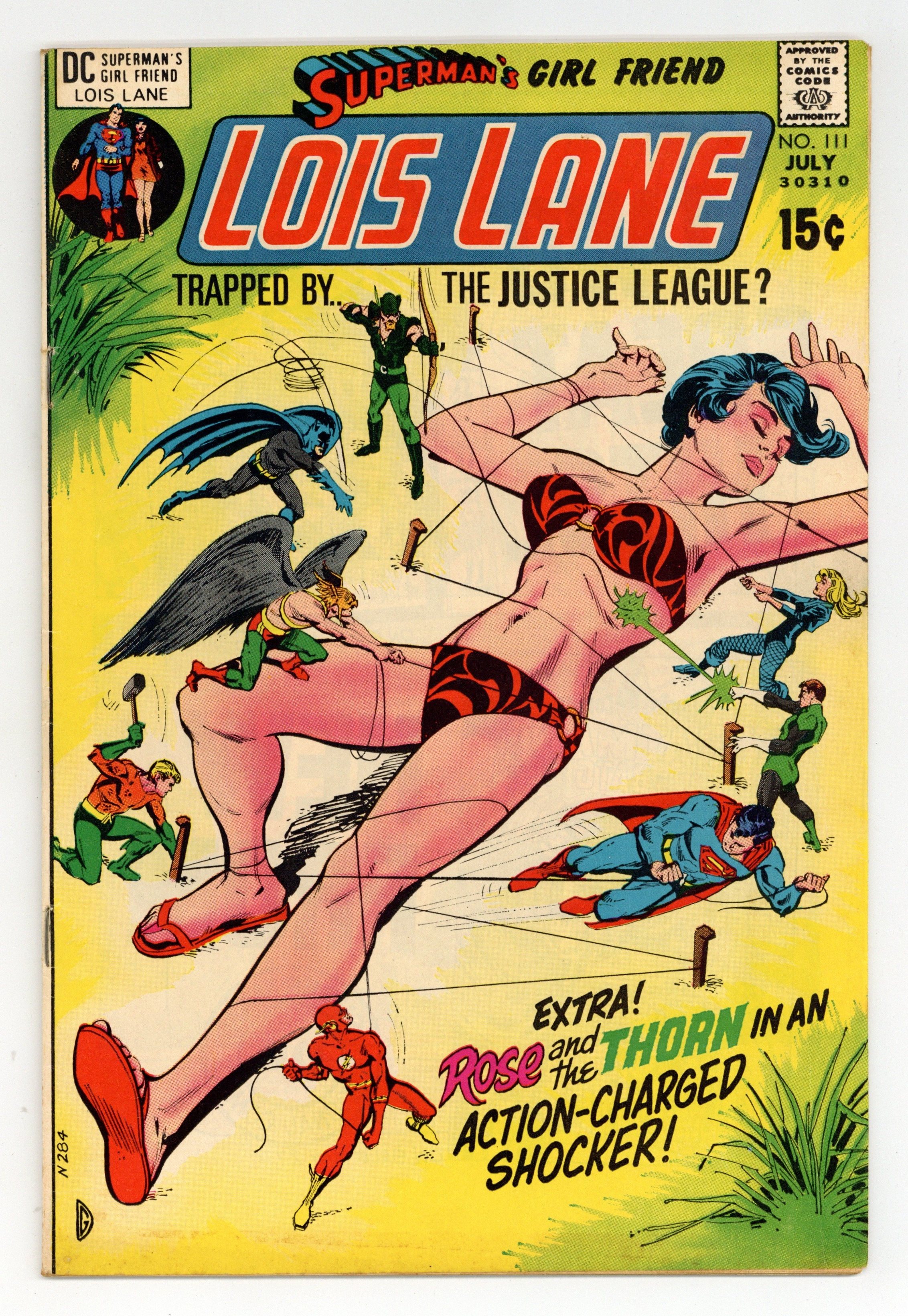 Cover art by Dick Giordano. The Dark Side of the Justice League!, script by Robert Kanigher, pencils by Werner Roth, inks by Vince Colletta and Murphy Anderson (Superman heads only); Evil scientists derive a potion to drive Superman mad; They have miniature clones of the Justice League apply it to Lois's lips while she's on vacation; When she kisses Superman, the potion takes effect and the mini JLA attacks her. Law of the 100!, script by Robert Kanigher, art by Gray Morrow; the 100 hires an amateur killer to eliminate the Thorn. House ad for In the Days of the Mob #1, pencils by Jack Kirby. 36 Pages, Full Color. Cover price $0.15. Grade: VG+ 4.5 explanation of grade Condition: Used (collectible)