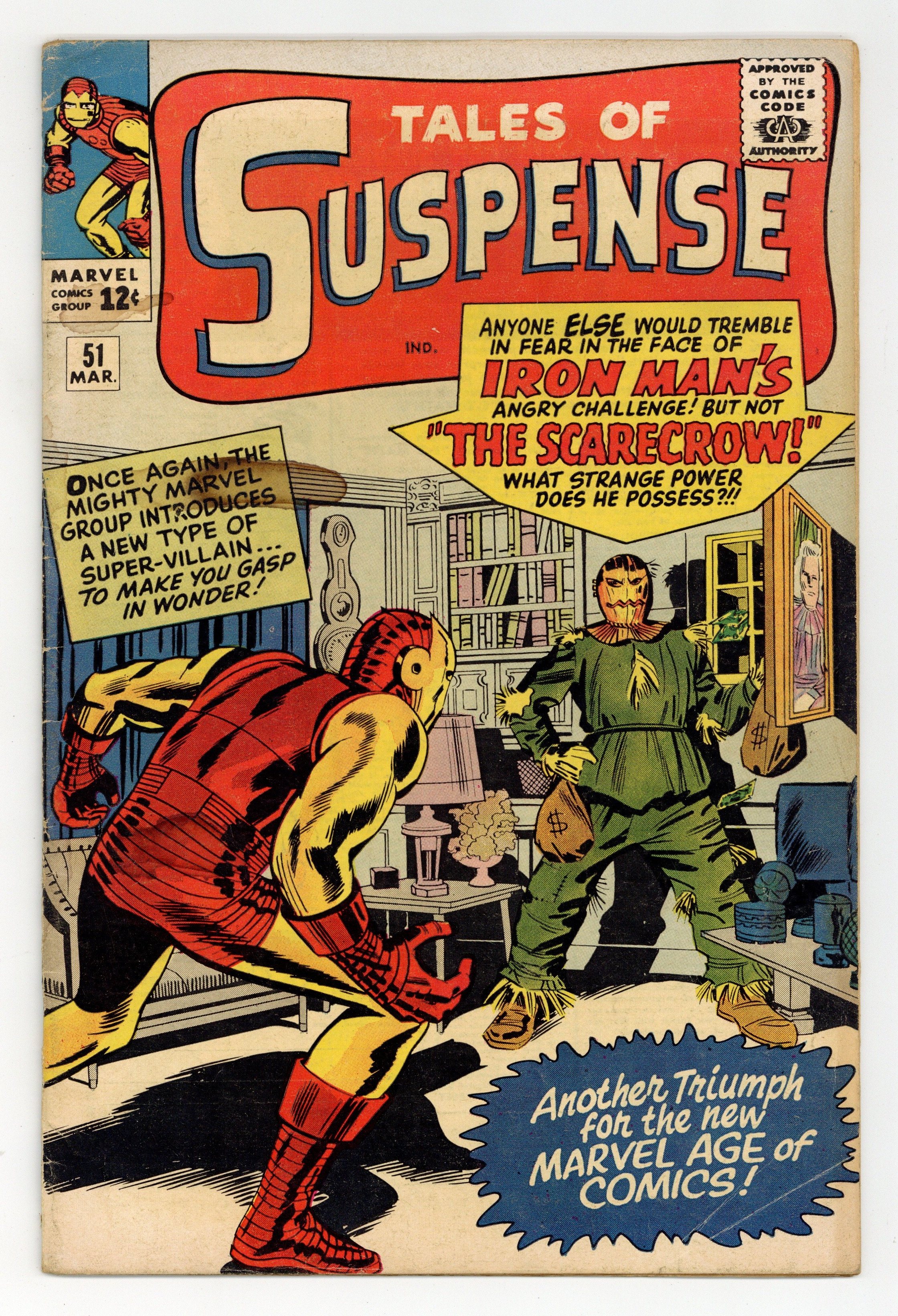 Cover pencils by Jack Kirby, inks by George Roussos. First appearance of the Scarecrow in "The Sinister Scarecrow!", script by Stan Lee, art by Don Heck; A contortionist becomes the Scarecrow and steals some plans from Tony Stark to sell them to Cuba; Iron Man follows the Scarecrow and steals back the plans. "The Recipe" text story. "The Green Thing!", script by Stan Lee (plot) and Larry Lieber (script), pencils by Larry Lieber, inks by Matt Fox; A psychic alien plant lands on Earth and torments a human to prove its power, but it is eaten by a crow. "The Primitive!", script by Stan Lee (plot) and Larry Lieber (script), pencils by Larry Lieber, inks by George Roussos (as G. Bell); A space explorer finally gives up his quest to find a more advanced species, not knowing that the primitives he found were more advanced, until they invented the cobalt bomb. 36 pgs., full color. $0.12. Cover price $0.12. Grade: GD+ 2.5 explanation of grade Condition: Used (collectible)