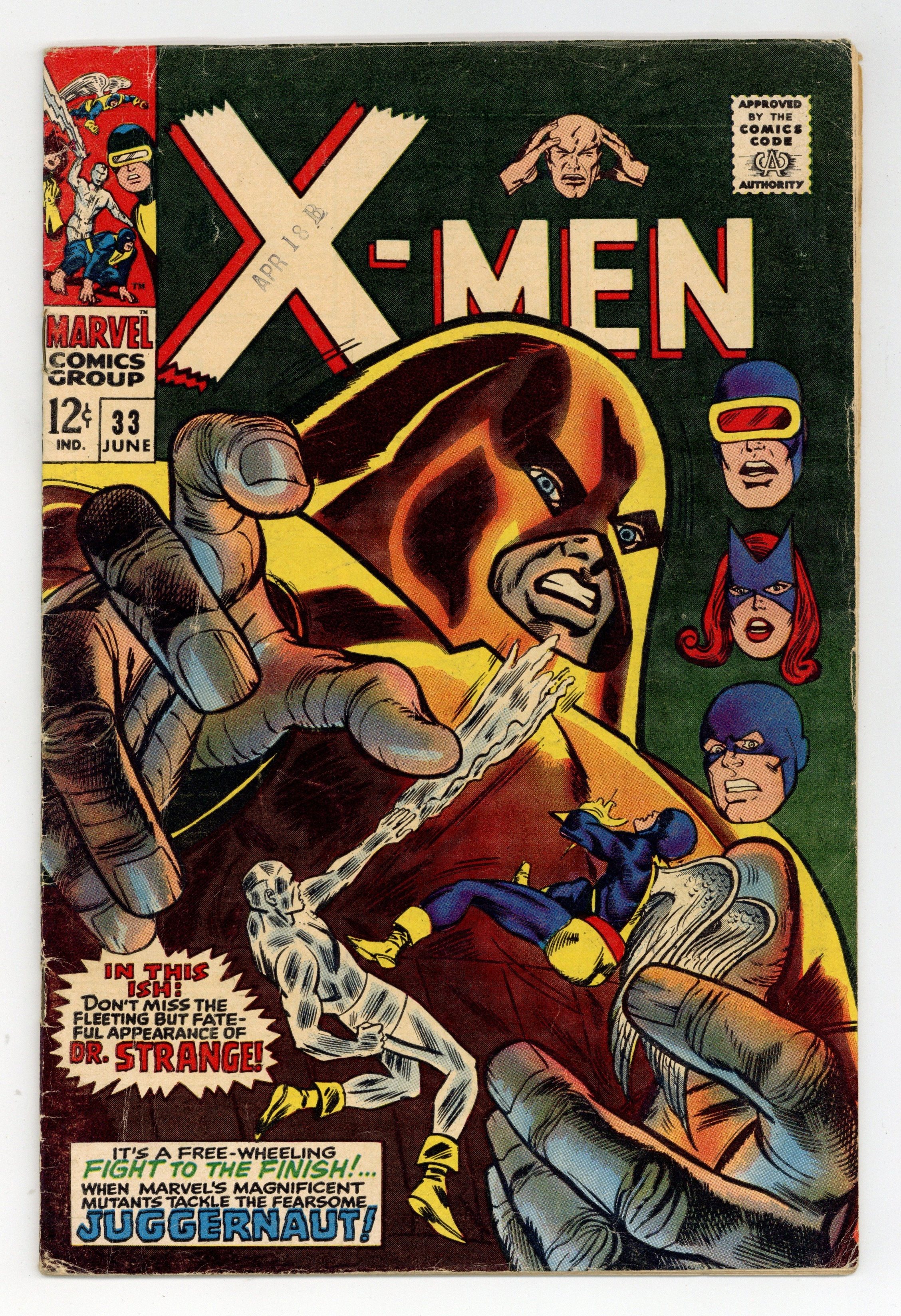 Cover pencils by Gil Kane, John Romita, and Werner Roth, inks by Gil Kane and John Romita; Juggernaut rampages to Factor Three headquarters; Professor X shows Jean a story about the ruby of Crimson Bands; Cameos by Doctor Strange and the Ancient One. Ad for the Merry Marvel Marching Society. 36 pgs. $0.12. Cover price $0.12. Grade: GD/VG 3.0 explanation of grade Condition: Used (collectible)