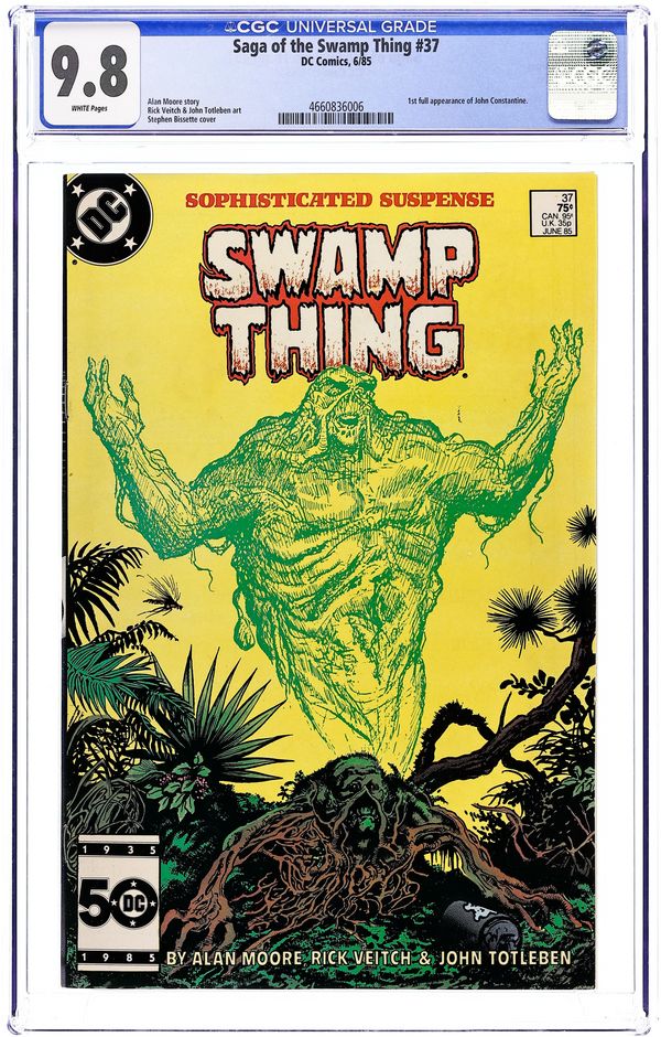 "Growth Patterns!" Written by Alan Moore, with art by Rick Veitch and John Totleben. Cover by Stephen Bissette and Totleben. New "Growth Patterns" and other strange abilities emerge in Swamp Thing as he fights for survival. NOTE: 1st appearance of John Constantine, Hellblazer. 36 pages, full color. Cover price $0.75. Grade: CGC 9.8 explanation of grade Condition: Used (collectible)