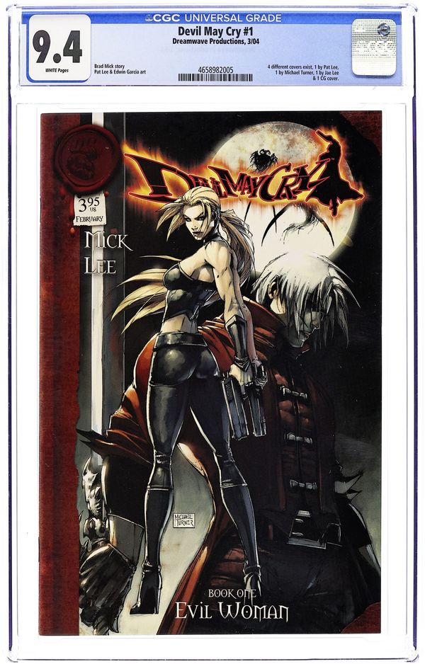Written by Brad Mick; Art by Pat Lee Dante leaps from the video game screen to the comic page in Dreamwave's new series Devil May Cry. In this issue, Trish gets the lowdown on the enigmatic Dante, as we watch the half demon/half human gun-for-hire do what he does best--but is it enough when this merc with a mouth goes blow-for-blow against the demon lord known as Phantom? NOTE: This issue will ship with 4 covers in equal ratio. Artists include Jae Lee, Michael Turner, a CGI cover, and Pat Lee! FC, 40pg$3.95Monthly Cover price $3.95. Grade: CGC 9.4 explanation of grade Condition: Used (collectible)