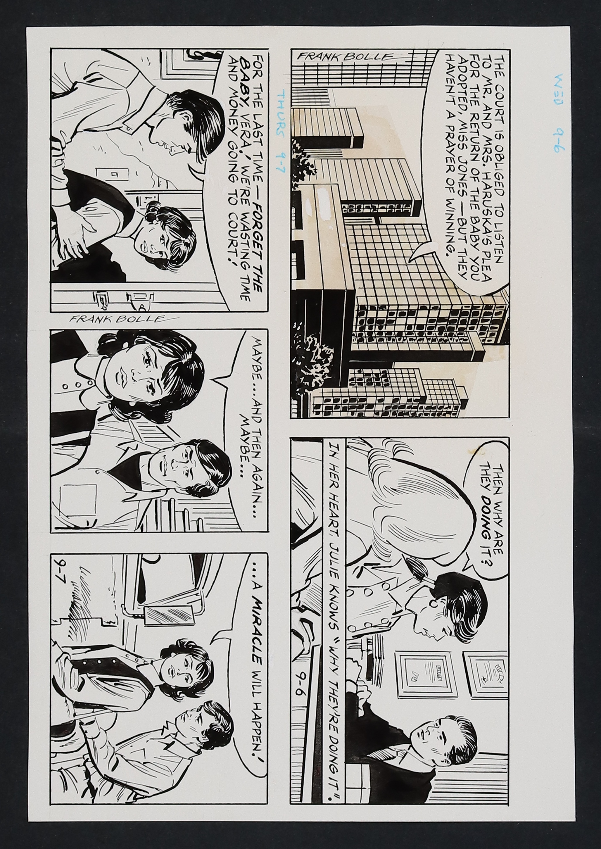 Pencil and ink on art board. 9 1/2" x 14 1/2". NOTE: The majority of the buildings in panel one of the 9/6 strip are pasted-in printed stats.