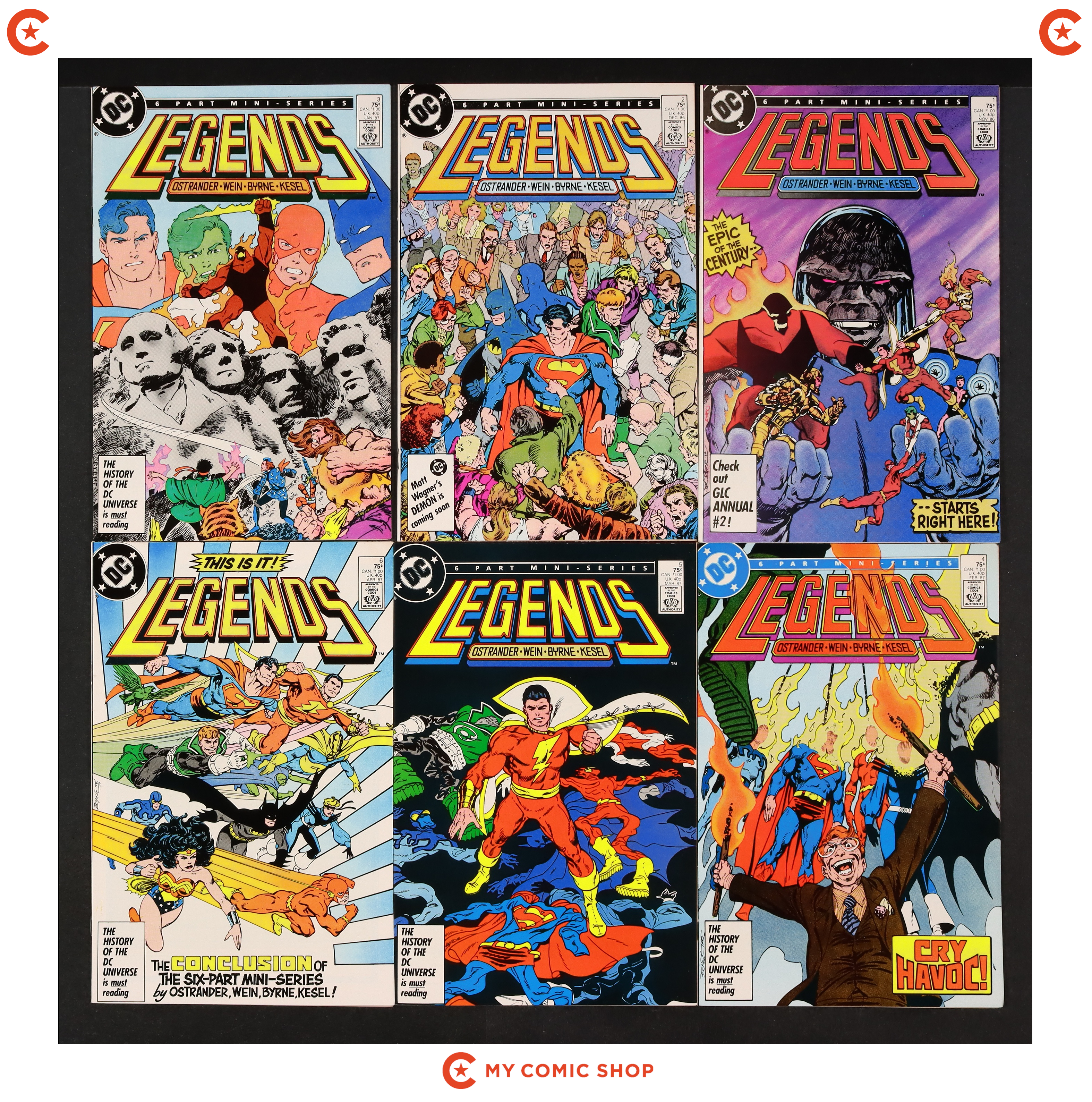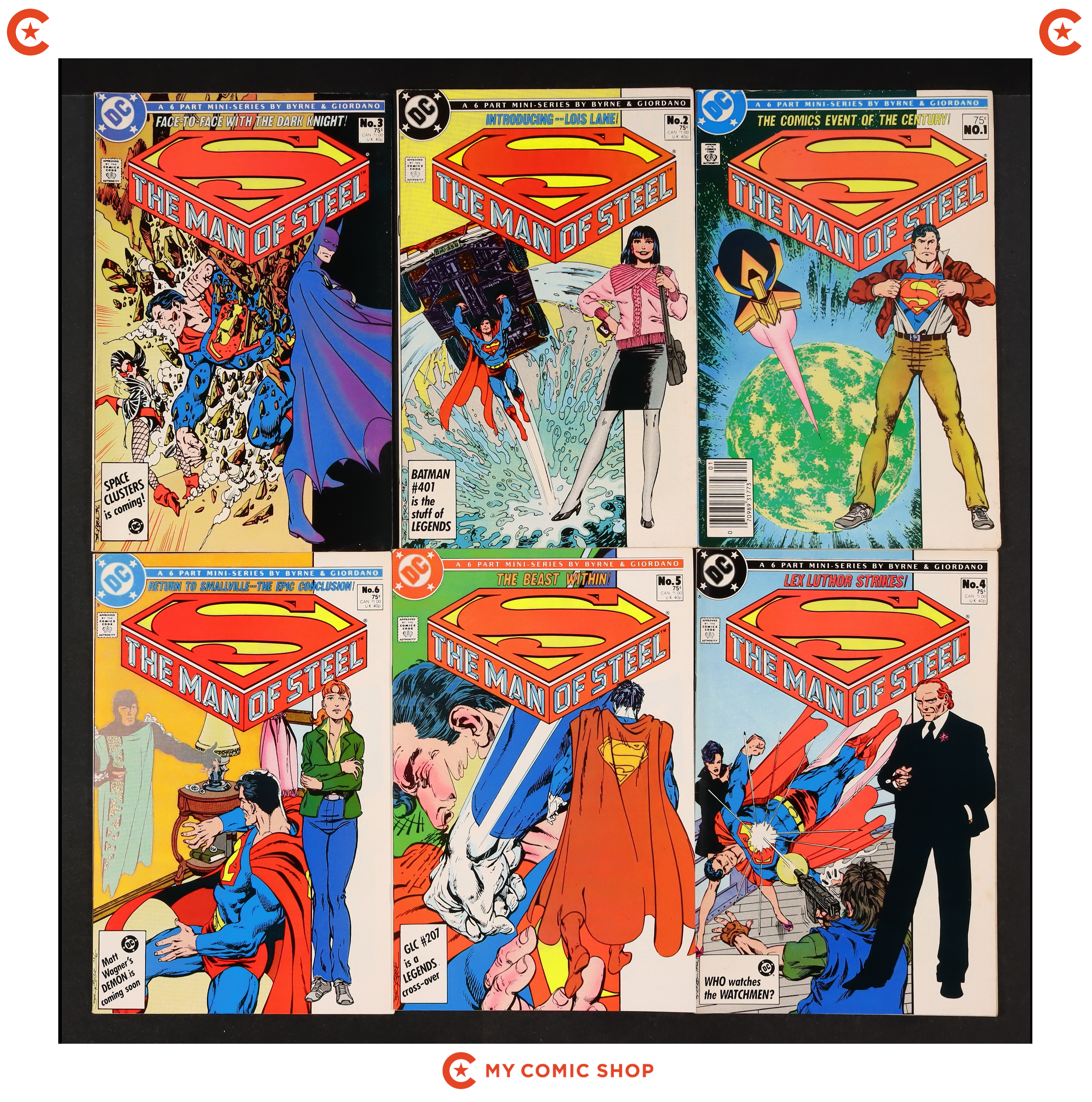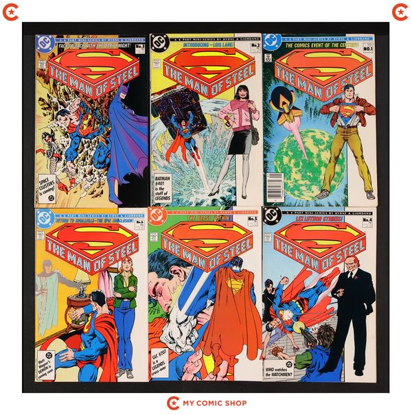 Issues 1B.N and 2-6 of Man of Steel (1986); and 1A and 2-6 of Legends (1986 DC). Most will grade in the VF to FN range.