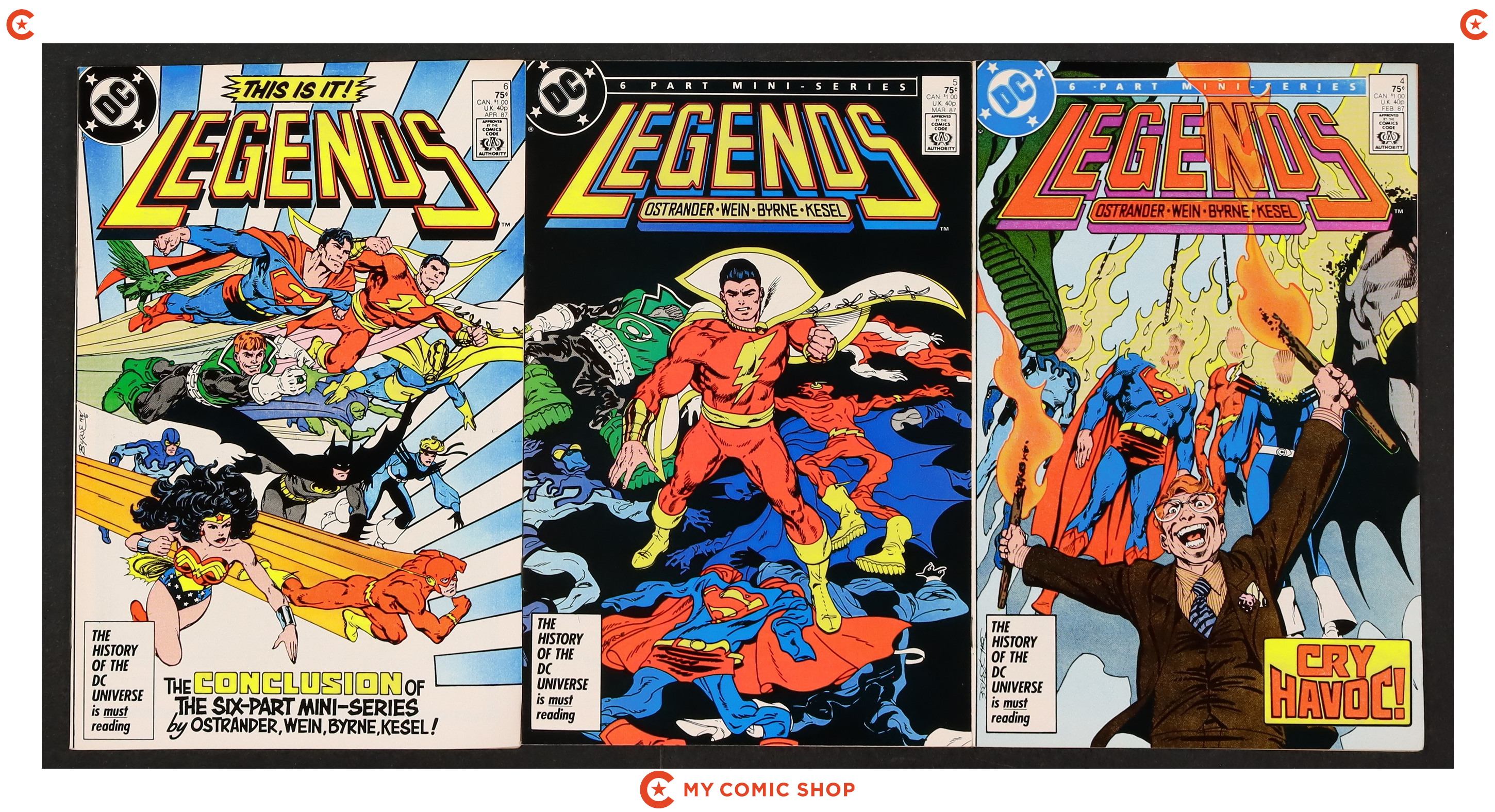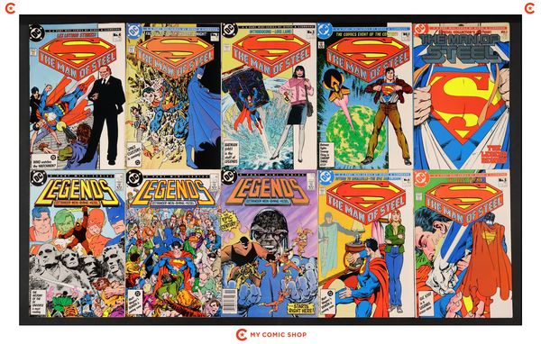 Issues 1A, 1B, and 2-6 of Man of Steel (1986); and 1A.N and 2-6 of Legends (1986 DC). Most will grade in the VF to FN range.