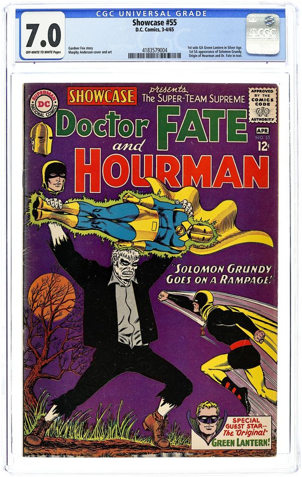 Cover by Murphy Anderson. 1st solo Golden Age Green Lantern in Silver Age (pre-dates Green Lantern 40), Doctor Fate, and Hourman star in "Solomon Grundy Goes on a Rampage!", script by Gardner Fox, art by Murphy Anderson; When Solomon Grundy last fought Green Lantern Alan Scott, Green Lantern encased Solomon Grundy in an emerald sphere prison floating above Earth; Years later, the sphere has now crash landed back on Earth, and Solomon Grundy has emerged to get his revenge on Green Lantern; Solomon Grundy instinctually heads back to his home of Slaughter Swamp, which at this point is bordering the Tyler Chemical Company plant; At the Tower of Fate, Kent Nelson is warned that there is trouble by his crystal ball; Seeing the source of the trouble to be Slaughter Swamp, Nelson becomes Dr. Fate; Hourman comes across Solomon Grundy in Slaughter Swamp; Hourman pops his Miraclo pill, then attacks Solomon Grundy. One-page text feature tells the origins of Dr. Fate and Hourman. 36 Pages, Full Color. Cover price $0.12. Grade: CGC 7.0 explanation of grade Condition: Used (collectible)