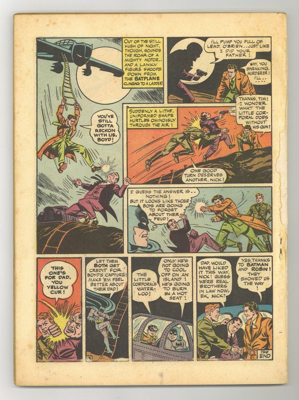 Cover art by Jack Burnley. Talent, Unlimited starring Superman, script by Jerry Siegel, pencils by Sam Citron [as Joe Shuster], inks by John Sikela [as Joe Shuster]; Clark Kent is given the assignment by Editor White to find a missing heiress, but along the way manages to help five other people realize their dreams.....as the Man of Steel! Tanks for the Memory starring Drafty, art by Stan Kaye. The Magic Lantern starring Zatara, script by Gardner F. Fox, art by Joseph Sulman. Stripesy, Solo Sleuth Inc. starring The Star-Spangled Kid and Stripesy, script by Jerry Siegel, art by Hal Sherman. Private Pete humor page by Henry Boltinoff. The Luck of the Lepparts starring The Boy Commandos, script by Jack Kirby, pencils by Joe Simon, inks by Jack Kirby. The Unluckiest Man In The World starring The Green Arrow, script by Joseph Green, pencils by Cliff Young, inks by Steve Brodie. A Double For Trouble starring The King, script by Gardner F. Fox, art by Joe Gallagher. Brothers In Law! starring Batman and Robin, script by Jack Schiff, pencils by Jack Burnley [as Bob Kane], inks by Jack Burnley [as Bob Kane] and Ray Burnley (backgrounds); The untimely death of their father leads the O'Brien brothers to attempt to get even with his killer, while working at odds against one another. The Boy Commandos ad, pencils by Jack Kirby, inks by Joe Simon. 100 pages, Full Color. Cover price $0.15. Grade: Coverless explanation of grade Condition: Used (collectible)