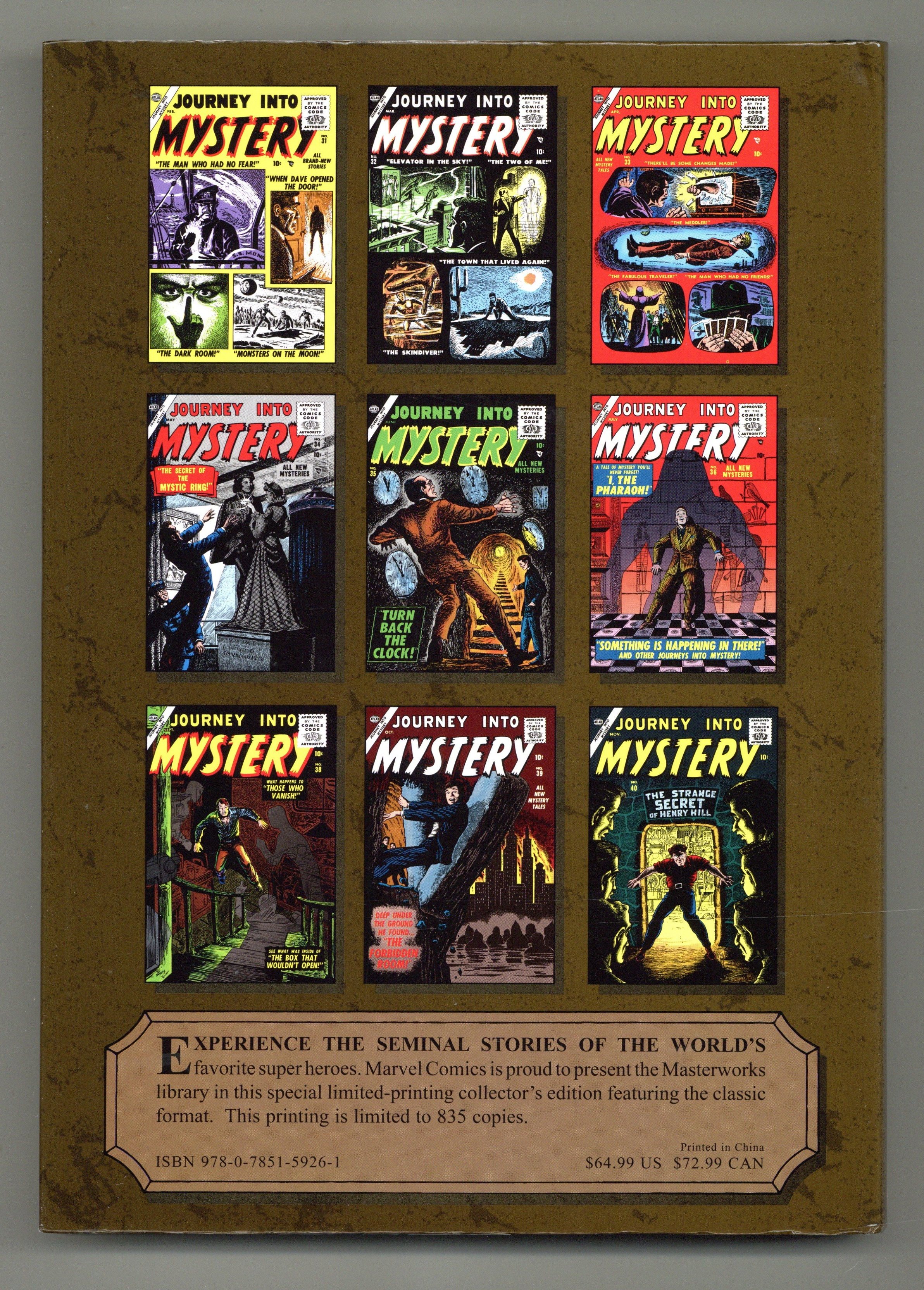 Volume 180 - 1st printing. "Atlas Era Journey into Mystery: Book 4!" Collects Journey into Mystery (1952-1962) #31-40. Cover by Bill Everett. The MARVEL MASTERWORKS once again go back to the days when horror ruled the racks. Yes, it's time to take a journey into mystery! And this volume offers a special treat: Steve Ditko's first story for Marvel. In 1956, at the beginning of his career, Ditko drew a handful of stories for Stan Lee - and you'll get not just one, but two of them here. Also providing heaping helpings of suspense, scares and twist endings are 1950s comics luminaries like Wally Wood, Al Wiliamson, Bernie Krigstein and Gene Colan. These rare stories are collected here for the first time and bring you one zombie-shuffling step closer to completing your JOURNEY INTO MYSTERY library! Reserve that copy today, True Believer! Hardcover, 272 pages, full color. NOTE: Limited to 835 copies. Cover price $64.99. Grade: VF/NM 9.0 explanation of grade Condition: Used (collectible)