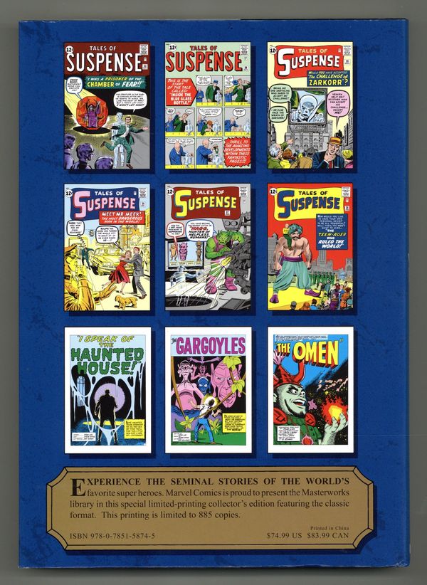 Volume 186 – 1st printing. "Atlas Era Tales of Suspense: Book 4!" Collects Tales of Suspense (1959-1968) #32-48, and #50-54. Written by STAN LEE and LARRY LIEBER. Art by JACK KIRBY, STEVE DIKTO, DON HECK and PAUL REINMAN. Cover by JACK KIRBY. The Marvel Masterworks bring you the final, fantastic volume of TALES OF SUSPENSE with another dose of giant monsters, intergalactic alien invaders and weird menaces. Including each complete pre-hero issue, as well as the many never-before-reprinted backup stories that supported Iron Man after his debut, crafted by a who's who list of top talent: Stan Lee, Jack Kirby, Steve Ditko, Don Heck, Jack Davis and more. This must-have volume brings you the stories that were the crucible for the Marvel Age of Comics, so don't wait - reserve your copy today! Hardcover, 304 pages, full color. NOTE: Limited to 885 copies. Cover price $74.99. Grade: VF+ 8.5 explanation of grade Condition: Used (collectible)