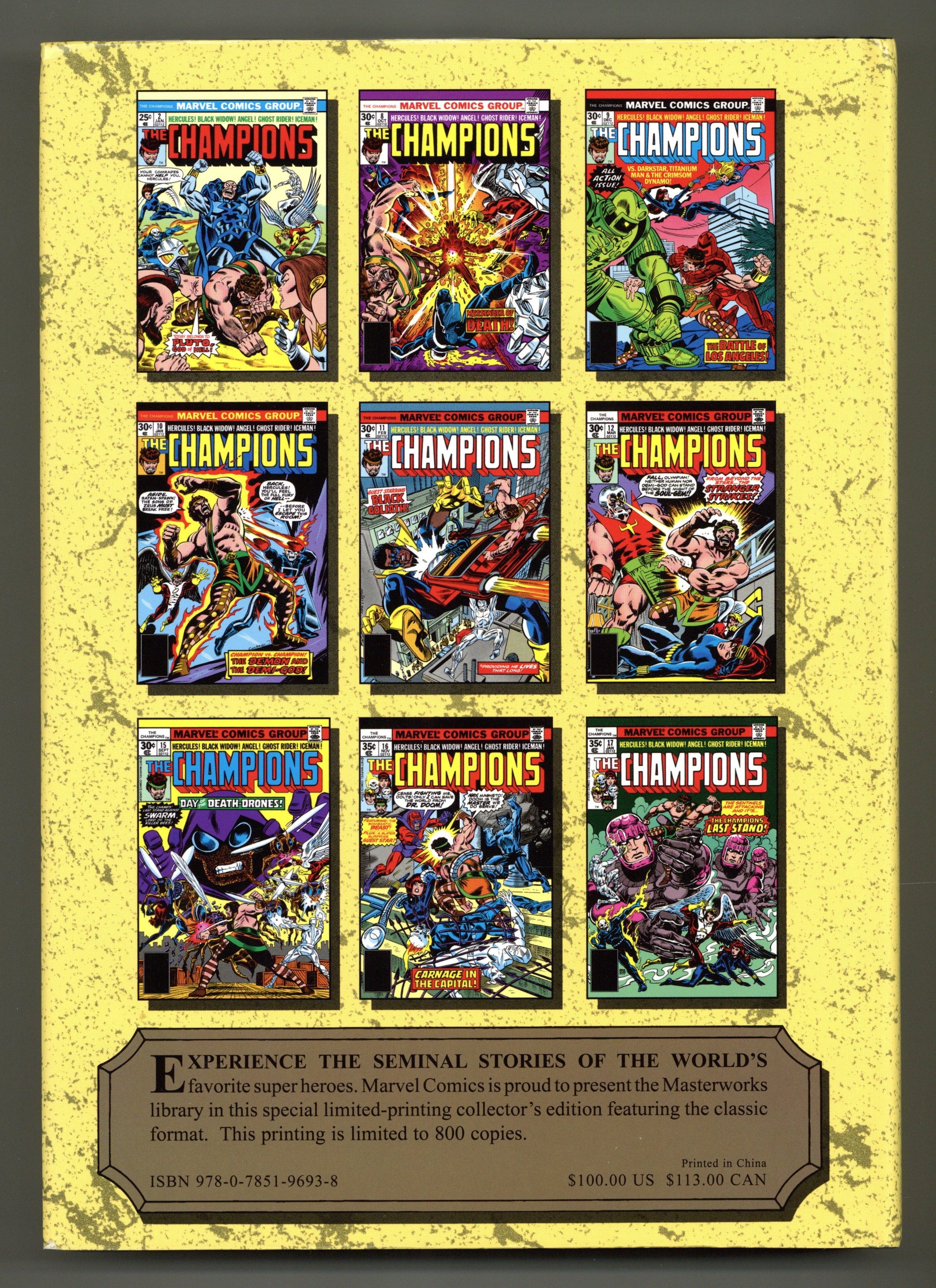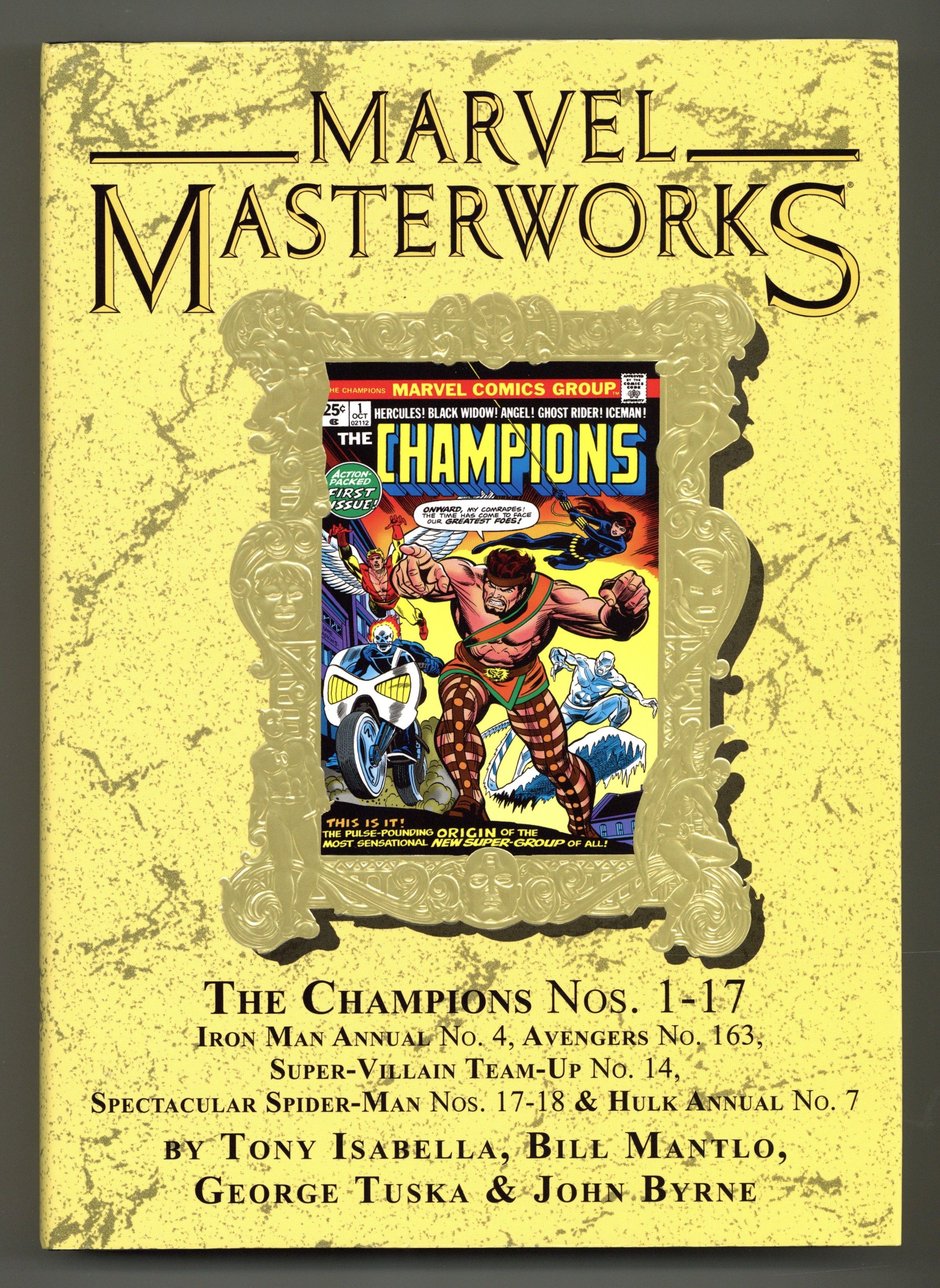 Volume 229 - 1st printing. "The Champions!" Collects Champions (1975-1978 Marvel) #1-17, Iron Man (1968-1996 1st Series) Annual 4, Avengers (1963-1996 1st Series) #163, Super-Villain Team-Up (1975-1980) #14 and Spectacular Spider-Man (1976-1998 1st Series)#17-18. Cover by Gil Kane. Join the Black Widow, Hercules, Ghost Rider, Iceman and Angel as they form an all-new super-team: the Champions! This massive Masterworks collects the Champions' complete adventures in a single volume! Every issue, every highlight, every page as the lives of these Marvel icons play out together. Their struggles will reveal the origin of the man who created the Black Widow, pit them against the combined might of Magneto and Doctor Doom; unleash the Crimson Dynamo and Titanium Man on Los Angeles; team them with the Stranger in the fight for an Infinity Gem; and bring fan-favorite artist John Byrne aboard for some of his greatest early work, including stories featuring the Sentinels and Brotherhood of Evil Mutants! Hardcover, 432 pages, full color. NOTE: Limited to 800 copies. Cover price $100.00. Grade: NM- 9.2 explanation of grade Condition: Used (collectible)