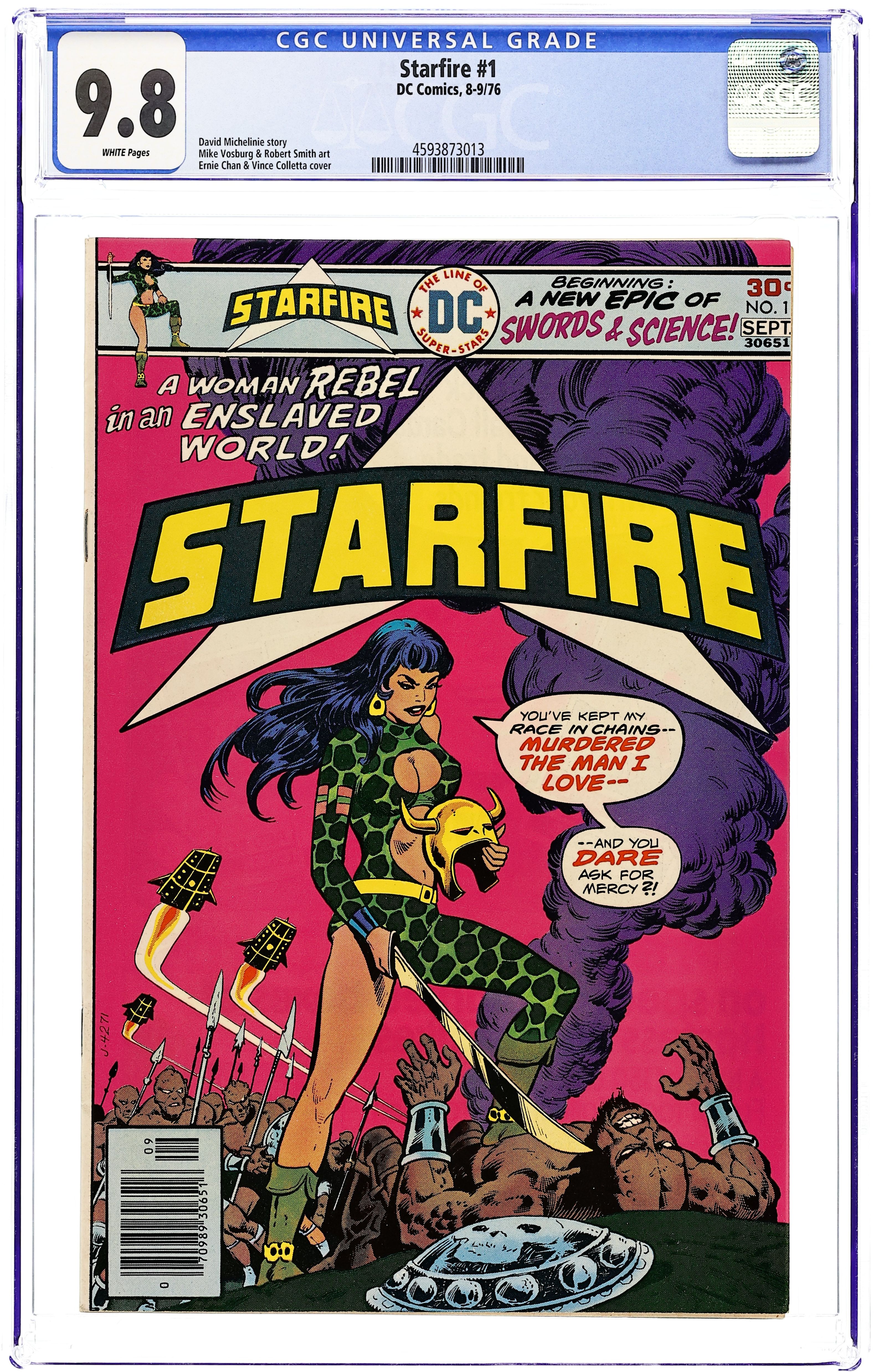Written by David Michelinie. Art by Mike Vosburg and Robert Smith. Cover by Ernie Chan and Vince Colletta. Starfire escapes from the Mygorg. She learns to fight from another human. She frees some slaves and starts building her own army. Article on the creative team for this series. 36 pages, full color. $0.30. Cover price $0.30. Grade: CGC 9.8 explanation of grade Condition: Used (collectible)