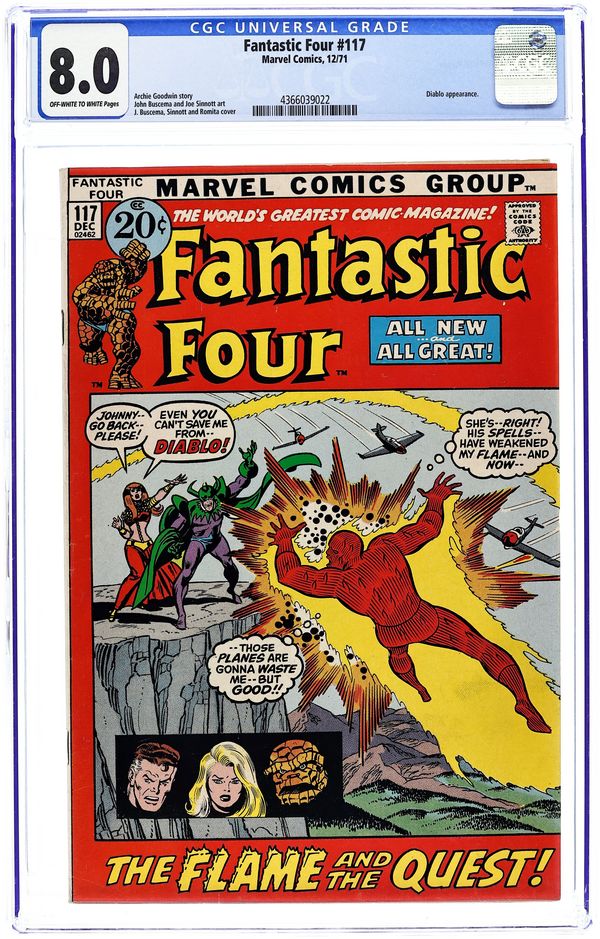 "The Flame and the Quest!" Part 1 of 2. Script by Archie Goodwin. Pencils by John Buscema. Inks by Joe Sinnott. Cover by John Buscema, John Romita (Crystal), and Joe Sinnott. The FF's epic battle with the Overmind is over. And Johnny Storm is ready to reunite with Crystal (last seen in Fantastic Four 105). But when the Human Torch arrives in the Great Refuge, Crystal is not there, and Maximus has taken over! Where is the inhuman elemental? The torch wants to know and flies to Whisper Hill to seek help from Agatha Harkness and his fabulous teammates. After several hours Agatha's mystic globe reveals the shocking truth! Crystal is in the heart of Central America in the hands of Diablo! Cameo appearances by Alicia Masters and Franklin. First 20ยข issue. (Note: Diablo previously appeared in Marvel Super-Heroes 20.) 36 pages Cover price $0.20. Grade: CGC 8.0 explanation of grade Condition: Used (collectible)