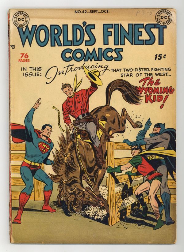 Cover art by Wayne Boring (Superman), Win Mortimer (Batman & Robin), and Howard Sherman (Wyoming Kid). The Alphabetical Animal Adventure starring Superman, art by Al Plastino; Aliens from Uranus come to Earth in flying saucers to collect two of every kind of animal, including humans. Little Pete humor page by Henry Boltinoff. The Unknown Adventure, script by Otto Binder, art by George Papp; Green Arrow goes to Mars! The Knights of the Square Table starring Doc & Fatty, art by Howard Sherman. On the Vengeance Trail starring the Wyoming Kid, script by Ryerson Johnson, art by Howard Sherman. The Sun-Born Mountain Man bio on Gantry Daniels, art by Bruno Premiani. The Varmint and the Wizard starring Zatara, art by Joe Kubert. Cowhide In the Clouds text article. Smokey the Bear Comes to The Rescue public service announcement with Peter Porkchops, script by Jack Schiff. The Amazing Adventure of Batman and Marco Polo starring Batman and Robin, script by Bill Finger, art by Jim Mooney; a time travel story. 76 Pages, Full Color. Cover price $0.15. Grade: PR 0.5 explanation of grade Condition: Used (collectible)