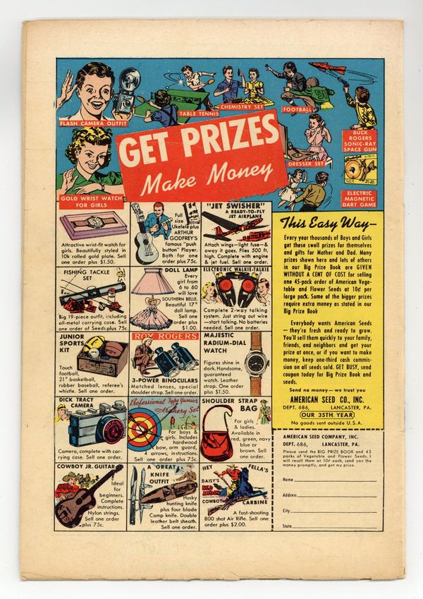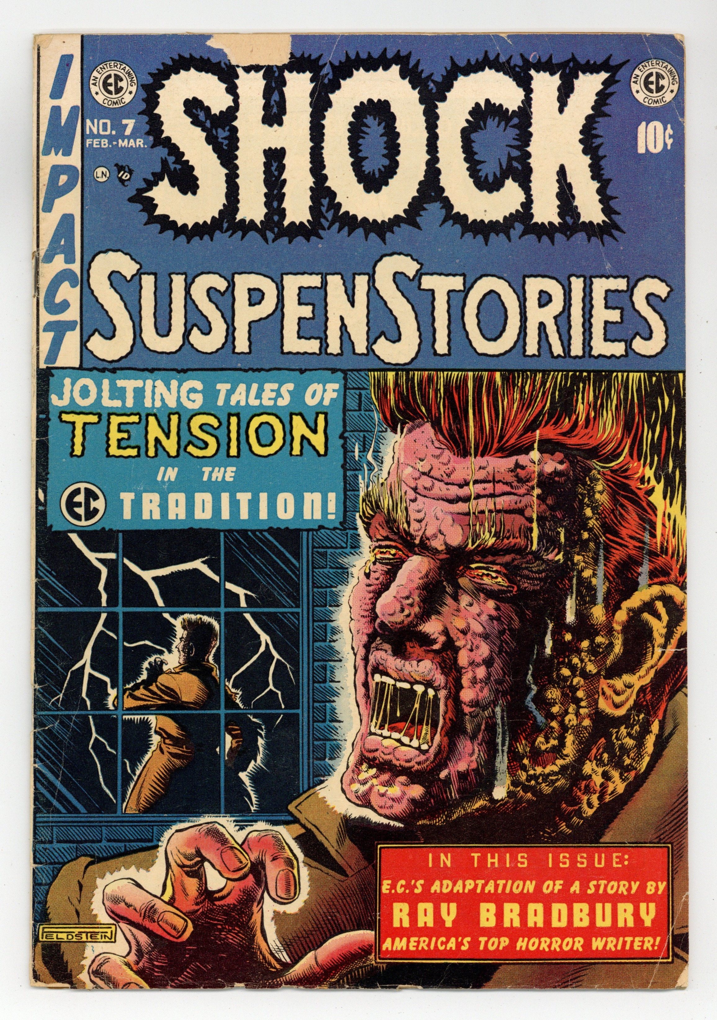 Cover art by Albert B. Feldstein. Beauty And The Beach!, script by Albert B. Feldstein, art by Jack Kamen; Two men are frustrated by the vanity of their attractive wives and the fact that they have offers to do some modeling and to participate in four beauty contests. The Bribe!, script by Albert B. Feldstein, art by Wally Wood; A fire inspector commits suicide when a fire breaks out in a night club where he took a bribe to overlook code violations; He thinks his daughter was killed in the fire with the other patrons because of a photo taken of her earlier that evening. The Mountain Jackal text story by Albert B. Feldstein. Infiltration, script by Albert B. Feldstein, art by Joe Orlando; This story postulates that a small government agency responsible for ferreting out Martian infiltrators is completely infested with Martian infiltrators except for a sole human whom they gun down. The Small Assassin!, script by Ray Bradbury and Albert B. Feldstein (adaptation), art by George Evans; a mother is paranoid that her newborn baby is attempting to kill her. 36 pgs. $0.10. Cover price $0.10. Grade: GD/VG 3.0 explanation of grade Condition: Used (collectible)