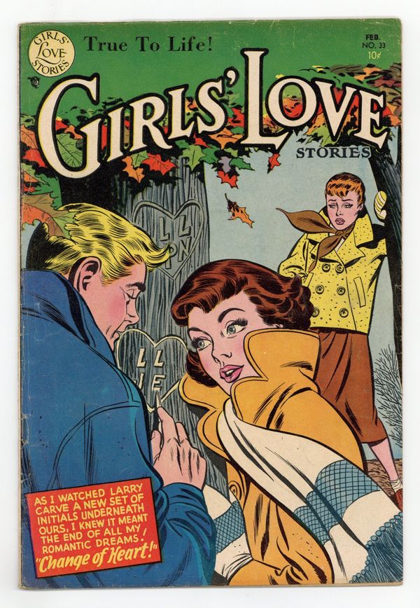 Last pre-code. As she watched Larry carve a new set of initials underneath theirs, she knew it meant the end of all her romantic dreams! "Change of Heart" is the cover-featured 8 page story. Plus: 8 page story "Frozen Heart"; 7 page story "There'll Be No Wedding"; 6 page story "Love between Strangers"; 2 page text article "Romance behind Words." Cover price $0.10. Grade: VG 4.0 explanation of grade Condition: Used (collectible)