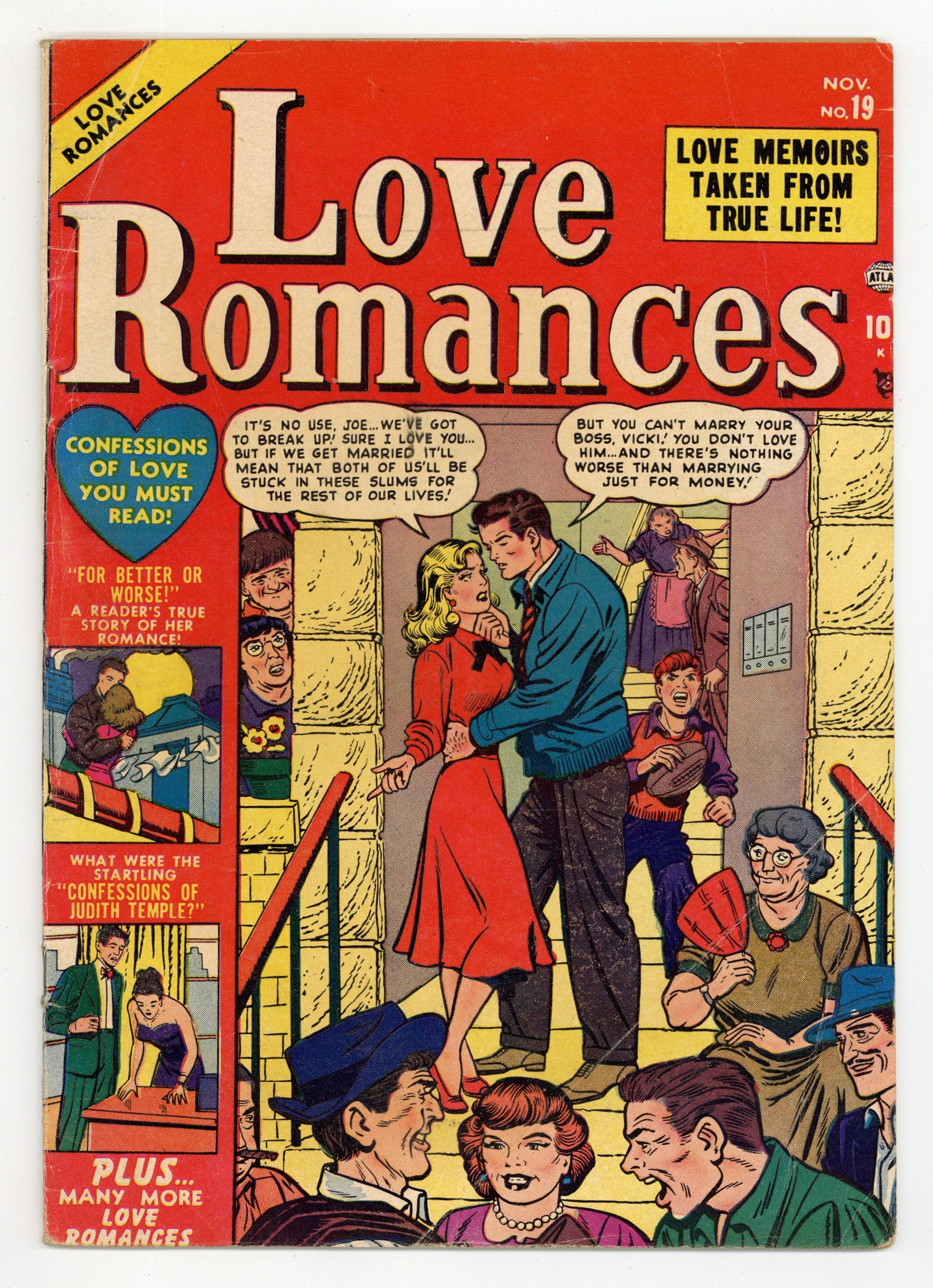 Cover inks by Christopher Rule. Edited by Stan Lee? Stories by Hank Chapman and unknown. Art by Al Eadeh, Ralph Owen, Frank R. Sieminsky, John Prentice?, George Klein and unknown. When Vicki regrets marrying her employer, Calvin, her old fiance Joe reminds her she promised..."For Better or for Worse"! Plus: Sue goes on a date with Harve just to spite her jealous roommate Mae, but falls in love with him in "Love is a Girl named Sue"! Also: Connie realizes she's only making Tony miserable by making him give up his career as an acrobat to work in a shoe factory in "Such is my Love"! And: Eventually the small-minded inhabitants of Tribridge, Vermont force Judy to confess what happened when she and her father left town in "The Confessions of Judith Temple"! Plus: Pat missed meeting her roommate's cousin, Jim, at the train station. He was waiting for her back at the apartment with Judy, since Pat had forgotten it was Daylight Saving Time in the 2-page text story "Love Delayed"! 32 pages, full color. Cover price $0.10. Grade: VG 4.0 explanation of grade Condition: Used (collectible)