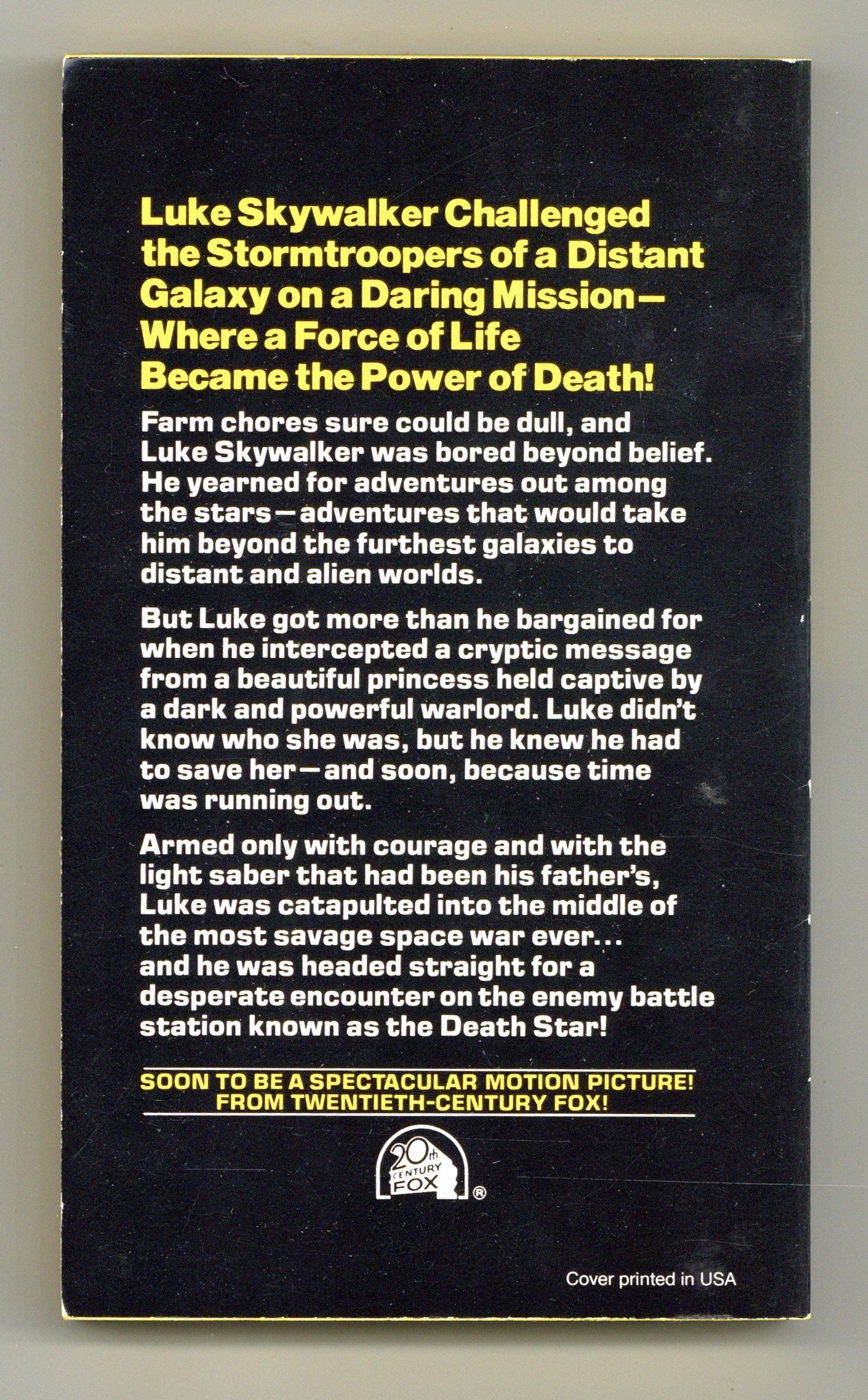 The first novelization of Star Wars A New Hope. Features the first published image of Darth Vader in his original design on the cover.