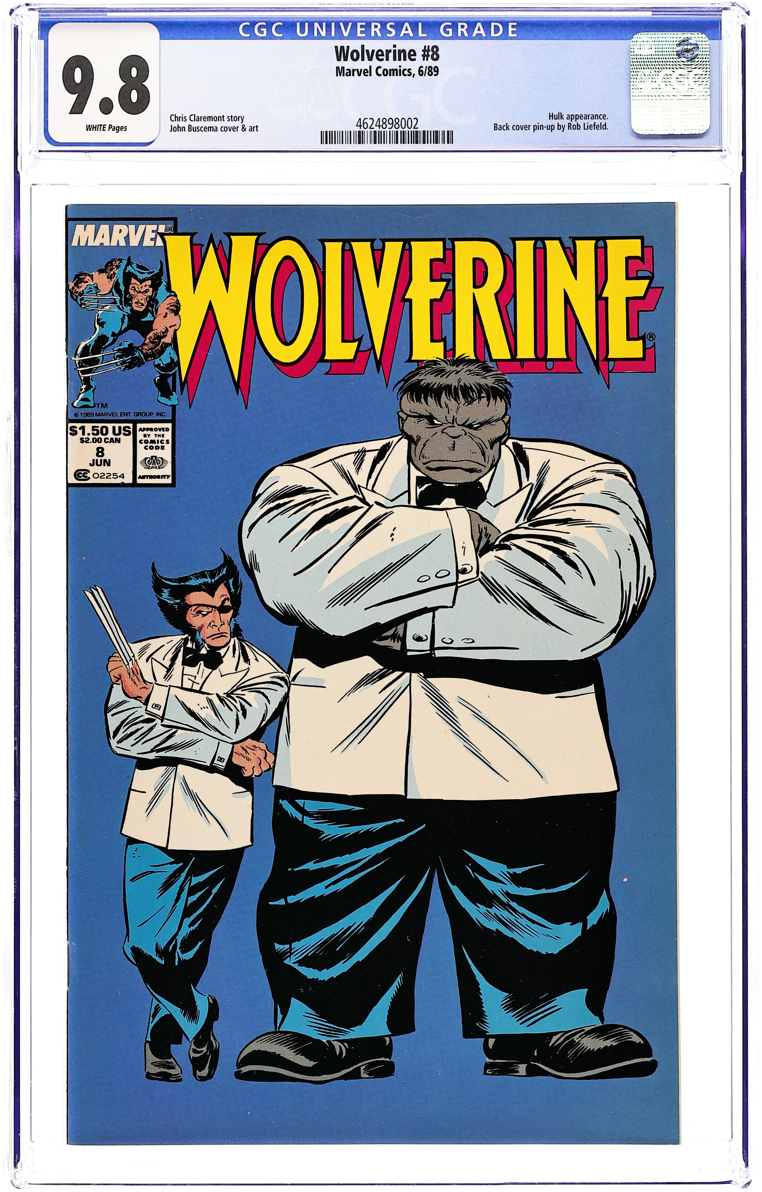Direct Edition. Part 2 of 2 - "If It Ain't Broke...!" Guest-starring the Incredible Hulk. Written by Chris Claremont. Art by John Buscema . In a humorous turn of events, using the Hulk's brute strength to do his dirty work for him, Wolverine tricks the Grey Goliath into trashing Coy's slave ring and cocaine operation. Rob Liefeld art on back cover. Cover price $1.50. Grade: CGC 9.8 explanation of grade Condition: Used (collectible)