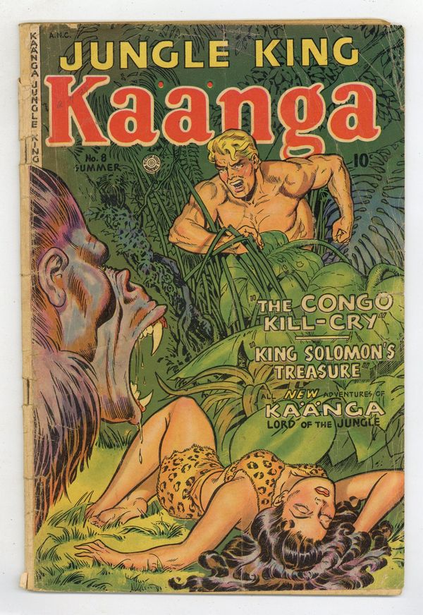 Cover art by Maurice Whitman. Untitled story, pencils by Robert Webb; Borungu witch doctor, B'fonga, schemes with treasure hunters to steal the Bufungus' sacred idol. Kaänga exposes Borungu and restores the idol to the tribe. "When the Earth was Young" non-fiction African Wild Life story, art by Fran Hopper. Untitled story, pencils by Robert Webb; During their annual war games, the L'dongu sub-chief frames the Bathongas with the crime of attempting to kill during the games; Kaänga exposes D'burra's plot and restores peace between the tribes. "Jackal Justice" text story by Frank Riddell. Untitled story, pencils by Robert Webb; Crooked trader Sanchez ambushes the B'kutas' gift for the commissioner of trained elephants; Kaänga defeats Sanchez's force and captures Sanchez for punishment by the commissioner. 36 pgs., full color. Cover price $0.10. Grade: GD- 1.8 explanation of grade Condition: Used (collectible)
