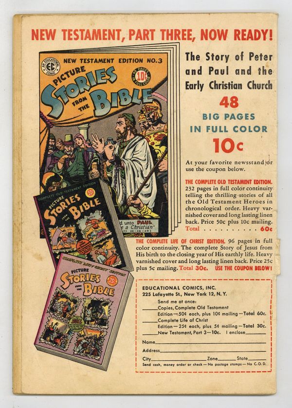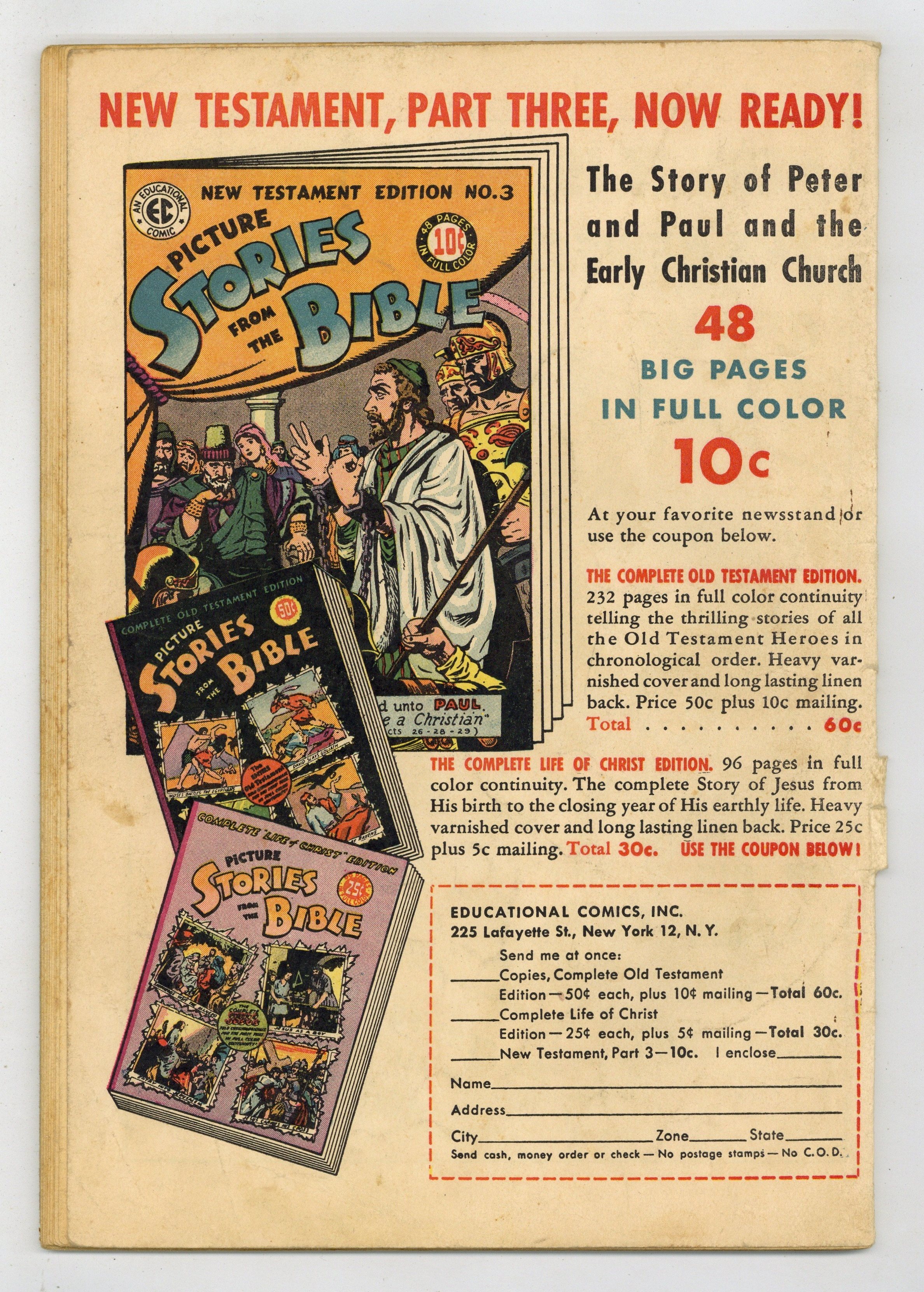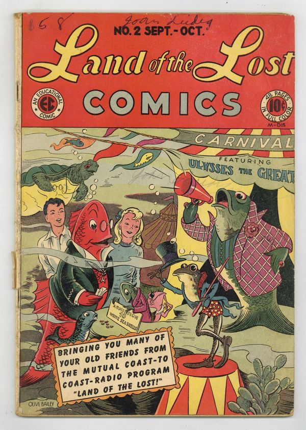 Cover by Olive Bailey. Stories by Isabel Manning Hewson and Al Chase. Art by Olive Bailey and Dennis Neville. The comics adaptation of a popular children's radio show, from back when EC was still run by Max Gaines and called "Educational Comics." Isabel and Billy travel to a magical undersea kingdom after befriending Red Lantern, a talking fish. Isabel and Billy go undersea to meet midget performer Ulysses the Great and his manager, Pee Wee Barnum. Then they find themselves lost in the Disappearing Desert. In a story sanctioned by the American Museum of Natural History, the life of African explorer Carl Akeley is given the comics biography treatment, 1950s style. Plus ads for Picture Stories of the Bible and Picture Stories from American History, other early "Educational Comics" classics. Ulysses the Great!; The Disappearing Desert; Mystical Meteorites; The Story of Carl Akeley; Umbrella Land. 52 pages, Full Color. Cover price $0.10. Grade: VG- 3.5 explanation of grade Condition: Used (collectible)